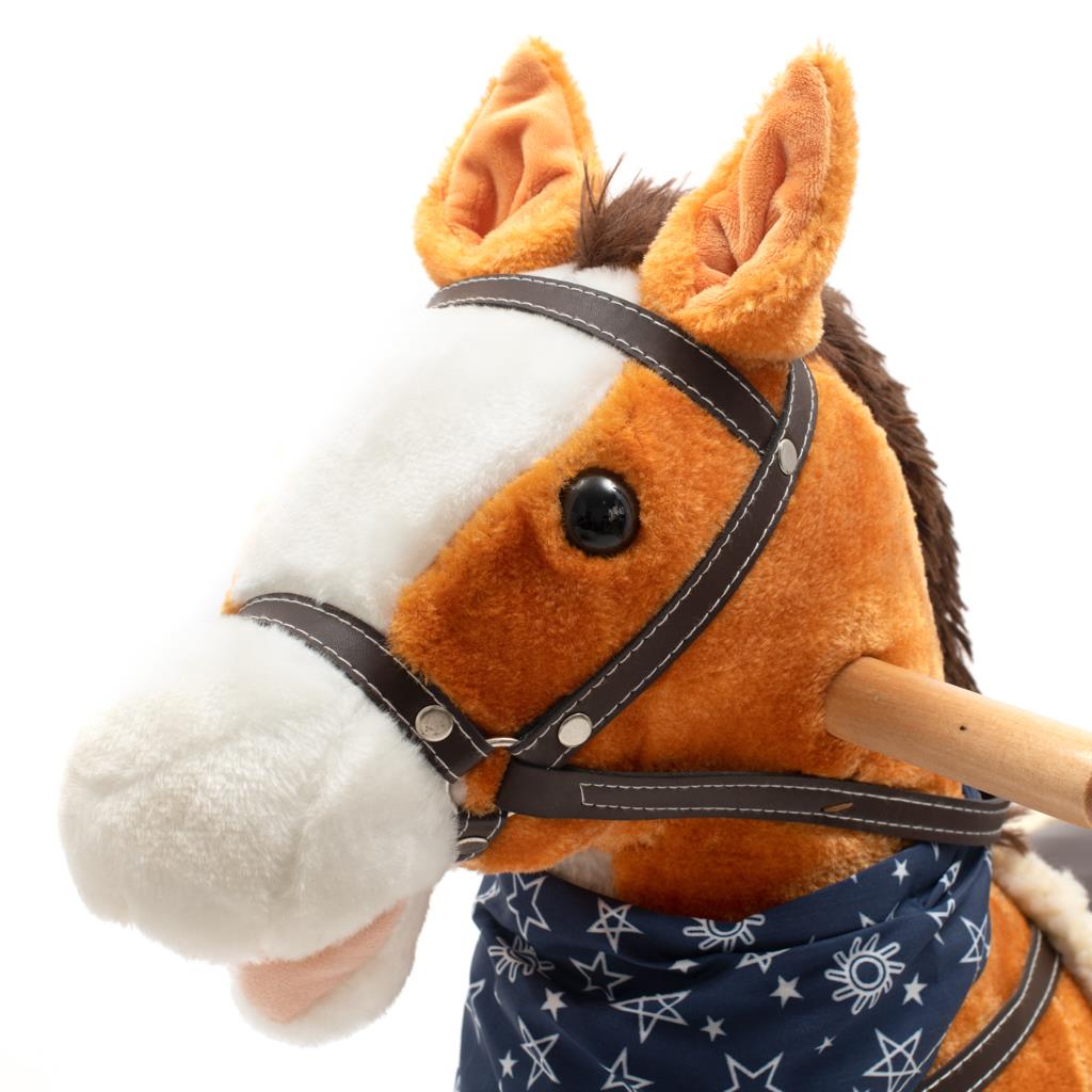 Izjemno lep viseči konjiček z rdečo maramo okoli vratu. Ob stisnjenju ušes konjiček zamahne s repom, odpre usta, izdaja zvoke galopirajočega konja ali poje pesmico. Udobno sedlo, trdna uzda, lesene ročice ali kovinske stremene zagotavljajo vašim mališim cowboyem še več stabilnosti in udobja med nihanjem. Izdelan je iz mehkega plišastega materiala, trdni leseni nikelj ali ročice pa se lahko enostavno odstranijo. Baterije se vstavijo v ohišje, ki se nahaja na trebuščku konjička.