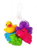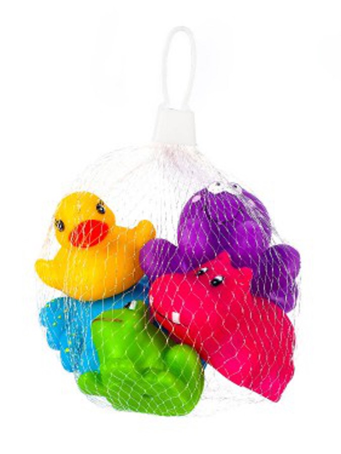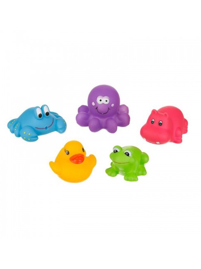 Barvne igrače za kopanje Akuku. Set 5 ljubkih barvnih igrač - račka, žaba, hipopotam, rak, hobotnica. Idealne za igro v kadi. Vesele barve pritegnejo pozornost naših najmlajših. Vsaka igrača ima odprtino, skozi katero lahko pršite vodo. Zaobljene oblike zagotavljajo varnost med igro. Izdelane so iz varnih, visokokakovostnih materialov, ne vsebujejo bisfenola A. Višina igrač je od 4 do 5 cm.