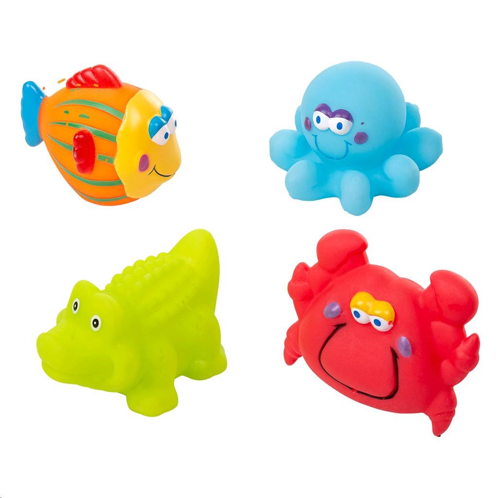 Barvite igrače za kopel Akuku. Paket 4 ljubkih barvitih igrač - ribica, želva, rak, hobotnica. Idealne za igro v kadi. Veselih barv, ki pritegnejo pozornost naših najmanjših. Vsaka igrača ima odprtino, skozi katero lahko pršite vodo. Zaobljene oblike zagotavljajo varnost med igro. Izdelane so iz varnih, visoko kakovostnih materialov, ne vsebujejo bisfenola A. Višina igrač je od 4 do 6 cm.