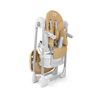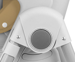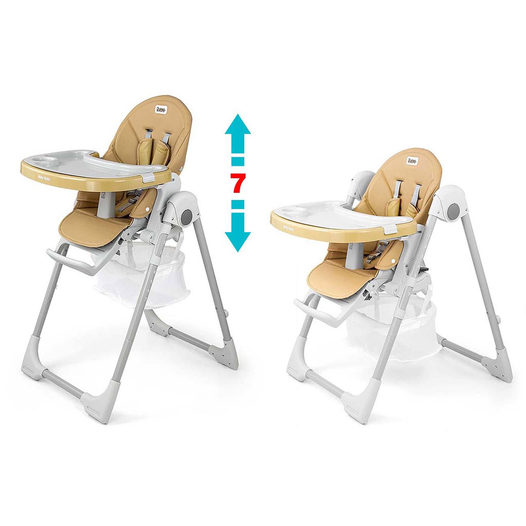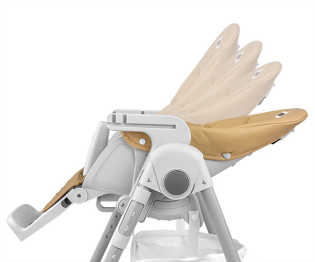 Oblačilo stolice je izdelano iz ekološke usnje in ima dodatno mehko blazino za najmlajše. Za varnost otroka je opremljena s 5-točkovnimi nastavljivimi pasovi in dodatno zaščito proti zdrsu. Na zadnji strani naslonjala je ročaj za obešanje pladenj. Naslonjalo in opiralnik za noge sta lahko nagibna do ležečega položaja. Sedež je mogoče dvigniti ali znižati v 7 stopnjah, noge pa imajo vgrajena gumijasta kolesca. Celotno konstrukcijo je enostavno in gladko zložiti.