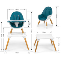 Sodobna in stylna otroška jedilna stolčka 2v1 Malmo. Izdelana je iz najkakovostnejših materialov - združuje funkcionalnost in sodoben dizajn. Različica visokega stolčka je namenjena otrokom od 6 mesecev do 36 mesecev oziroma do dosežene teže 15 kg, različica nizkega stolčka plus miza pa za otroke od 3 do 6 let ali do dosežene teže 25 kg.