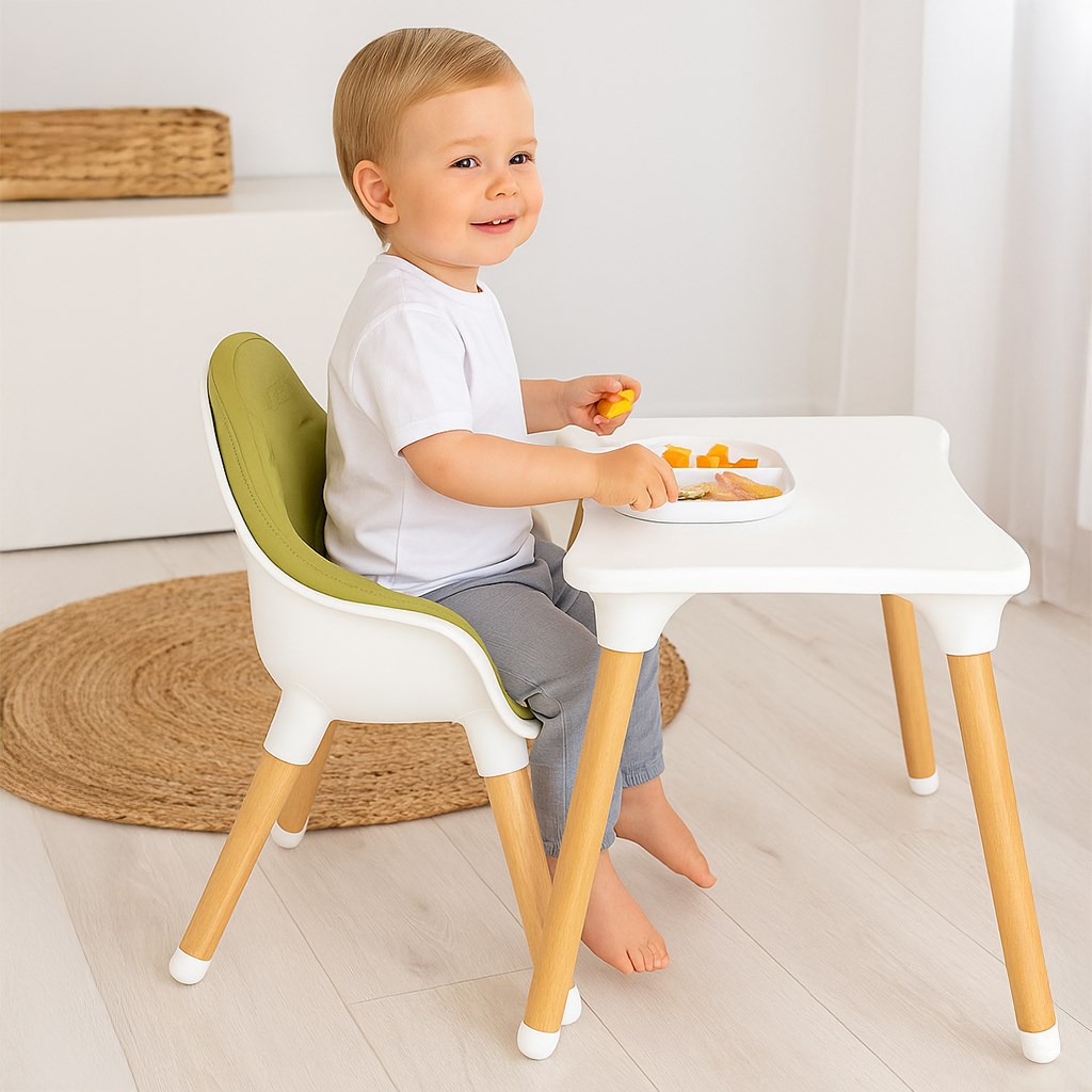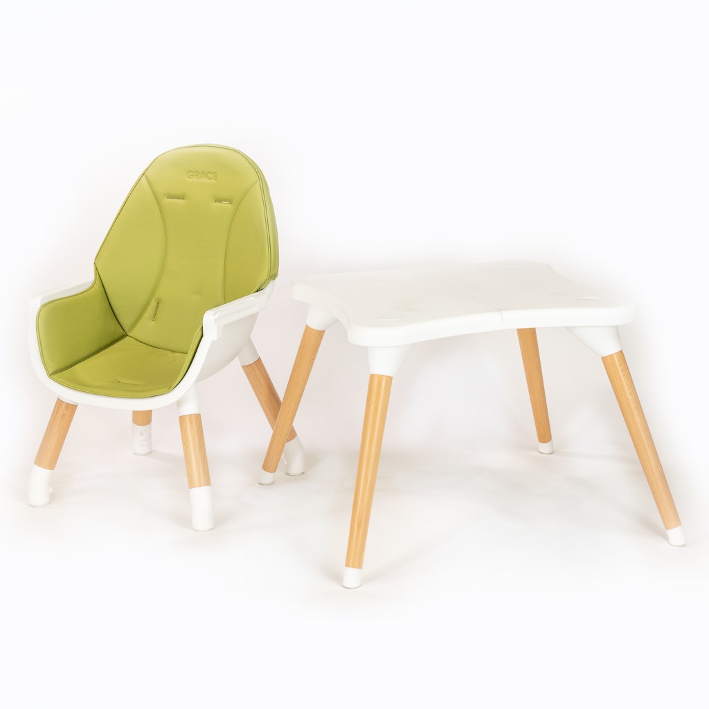 Moderna in izvirna otroška jedilna stolčka Grace češke blagovne znamke New Baby. Kombinacija bukovega lesa in sodobnih barv zagotavlja edinstven dizajn in minimalizem. Jedilni stolček Grace 3v1 je popolna izbira za prvi otroški stolček. Otroški stolček združuje 3 funkcije: visok jedilni stolček za hranjenje, nizek otroški stolček in set mizice + stolček.