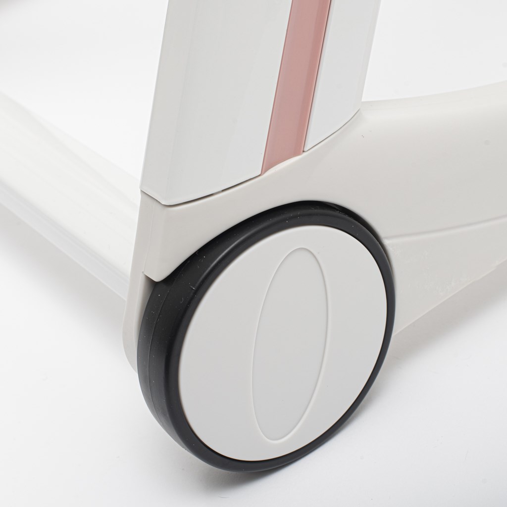 -Jedilna stolica je opremljena z dvema kolesoma z zavoro in dvema gumijastima nožicama.
