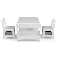 Večfunkcionalna otroška pohištvena garnitura. Miza SVEN z 2 stoličkama v beli in sivi barvi ter s sivimi dodatki je zasnovana tako, da otrokom nudi: udobje, prostor za ustvarjalno igro, risanje, pisanje in največje udobje pri aktivnostih. Garnitura vključuje 2 stoli z 2 tekstilnimi shranjevalnimi pripomočki, ki sta shranjena v polici pod stoli. Miza je opremljena s velikim prostorom za shranjevanje, ki se nahaja pod obojestransko odstranljivo ploščo. Ima tudi stranske shranjevalne police. Na eni strani mize je velika risalna tabla. Stoli so lahki in otroci jih lahko prosto premikajo. Pohištvo je izdelano z izjemno natančnostjo in skrbnostjo. Vsi stoli imajo zaobljene robove, kar otroka ščiti pred poškodbami. Vsi elementi konstrukcije mize in stoli zagotavljajo visoko stabilnost in zmanjšujejo tveganje padca. Garnitura Sven, narejena iz MDF, je odporna in enostavna za vzdrževanje. Pohištvena garnitura se enostavno sestavi in vse komponente, potrebne za montažo, so vključene v pakiranje.