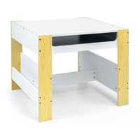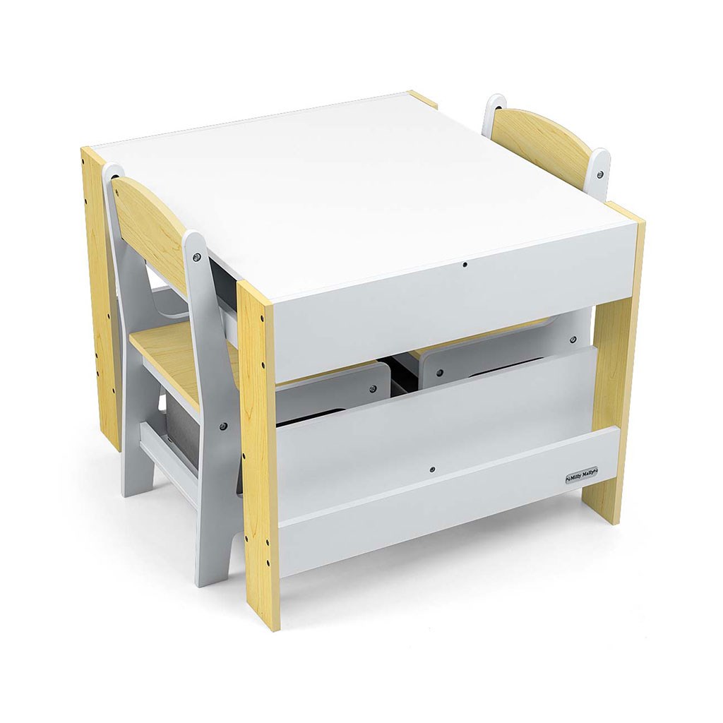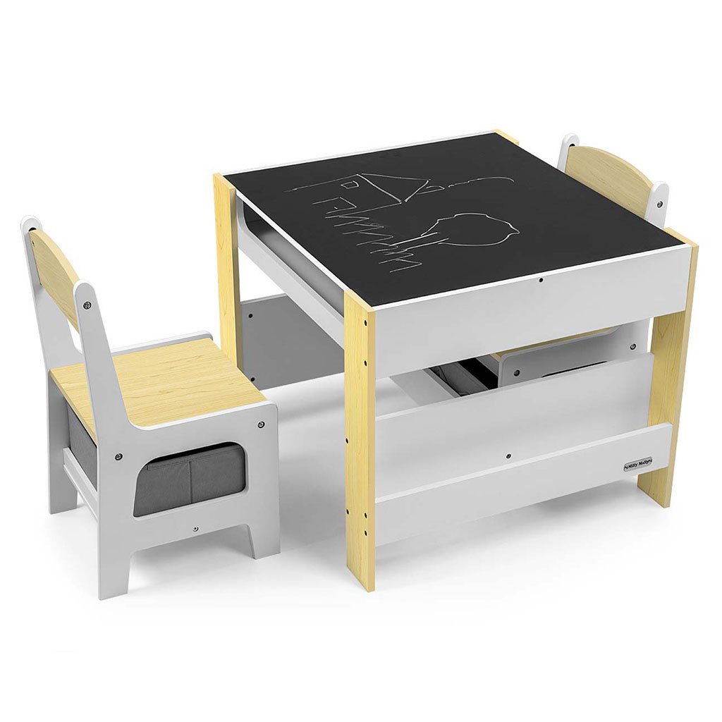 Večfunkcionalna otroška pohištvena garnitura. Miza SVEN z 2 stoličkama v beli in sivi barvi ter s sivimi dodatki je zasnovana tako, da otrokom nudi: udobje, prostor za ustvarjalno igro, risanje, pisanje in največje udobje pri aktivnostih. Garnitura vključuje 2 stoli z 2 tekstilnimi shranjevalnimi pripomočki, ki sta shranjena v polici pod stoli. Miza je opremljena s velikim prostorom za shranjevanje, ki se nahaja pod obojestransko odstranljivo ploščo. Ima tudi stranske shranjevalne police. Na eni strani mize je velika risalna tabla. Stoli so lahki in otroci jih lahko prosto premikajo. Pohištvo je izdelano z izjemno natančnostjo in skrbnostjo. Vsi stoli imajo zaobljene robove, kar otroka ščiti pred poškodbami. Vsi elementi konstrukcije mize in stoli zagotavljajo visoko stabilnost in zmanjšujejo tveganje padca. Garnitura Sven, narejena iz MDF, je odporna in enostavna za vzdrževanje. Pohištvena garnitura se enostavno sestavi in vse komponente, potrebne za montažo, so vključene v pakiranje.