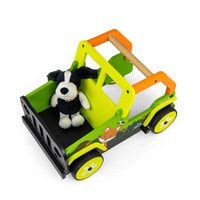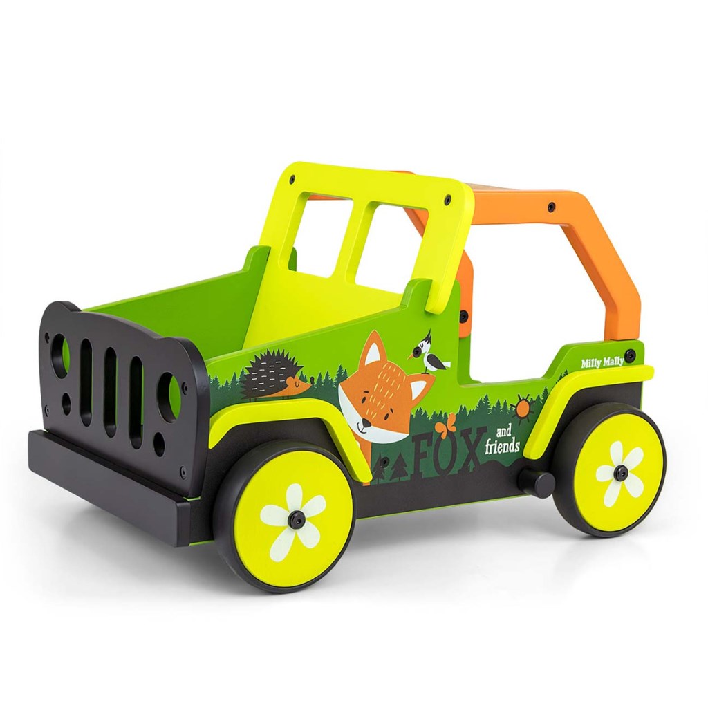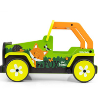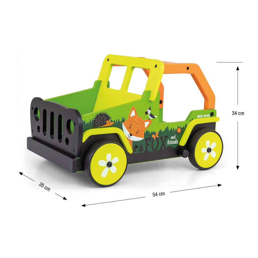 Ta otroški hodilnik, navdihnjen z legendarnimi terenskimi avtomobili, je izdelan iz visokokakovostnega lesa in okolju prijaznih materialov. Kolesni pokrovi so narejeni iz mehkega TPR plastike, ki je fleksibilna in odporna ter omogoča uporabo na vseh površinah brez poškodb ali prask. Ne vsebujejo mehčalcev in so prijazni do okolja.