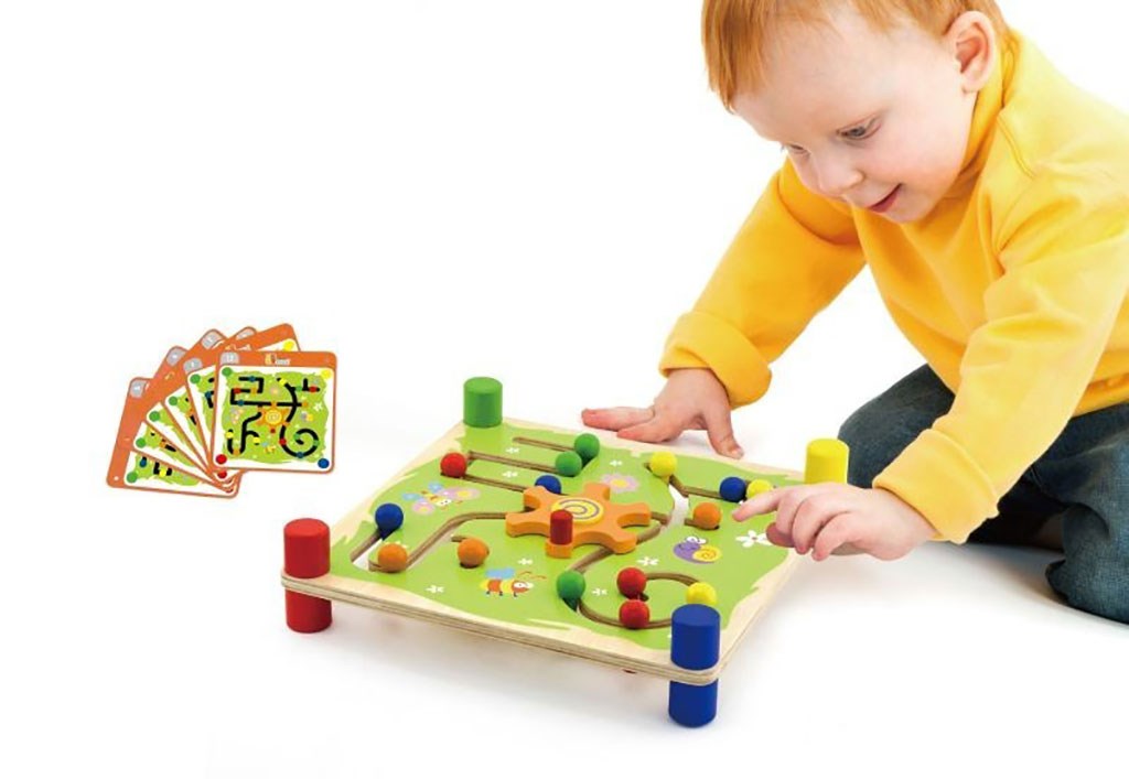 "Labirint" je manipulacijska igra v obliki robustne lesene plošče s 4 labirinti in vrtečim zobatim kolesom na sredini ter 12 kljukicami v 4 barvah. Igra temelji na premikanju barvnih kljukic po plošči labirinta, tako da so vse postavljene glede na vzorec, naveden na 6 vzorčnih kartah.