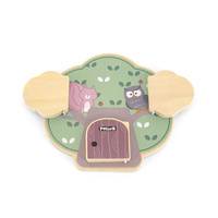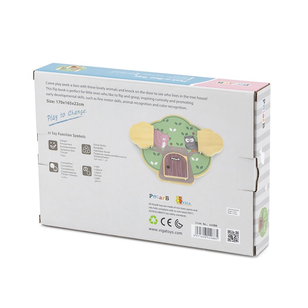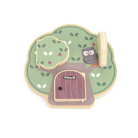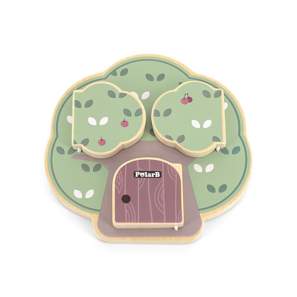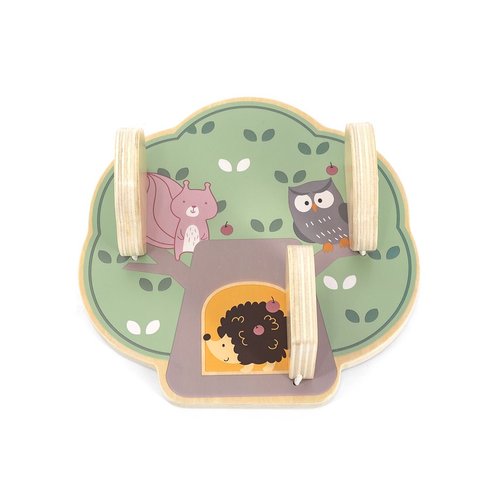 Predstavljamo leseno manipulativno ploščo v obliki drevesa, ki odlično razvija čutno in logično razmišljanje otrok. Na leseni plošči so 3 vratca, za vsakimi vratci pa je drugačno žival: veverica, sova in ježek, ki na hrbtu nosi jabolka.