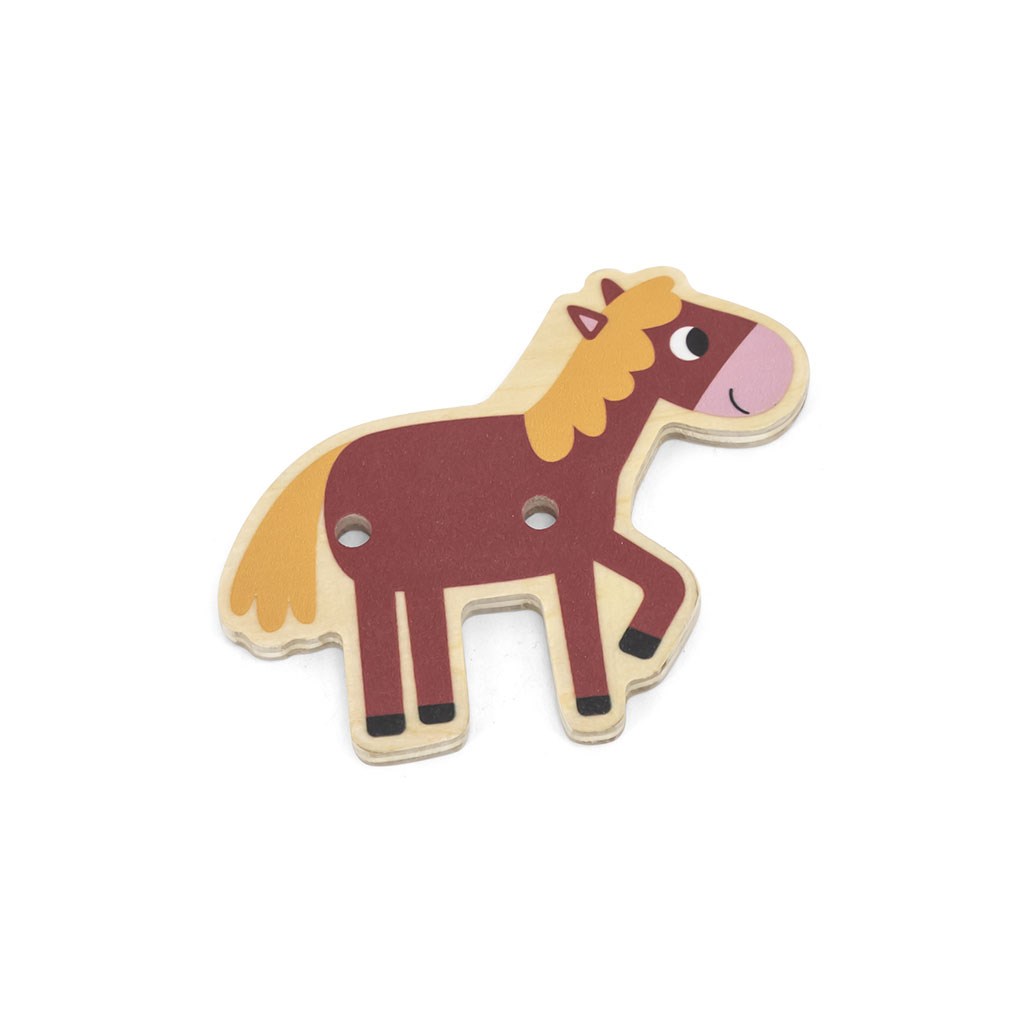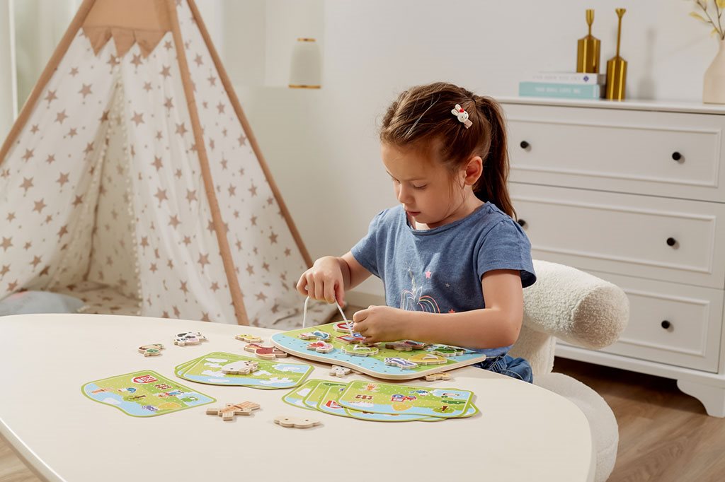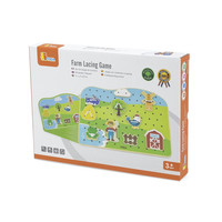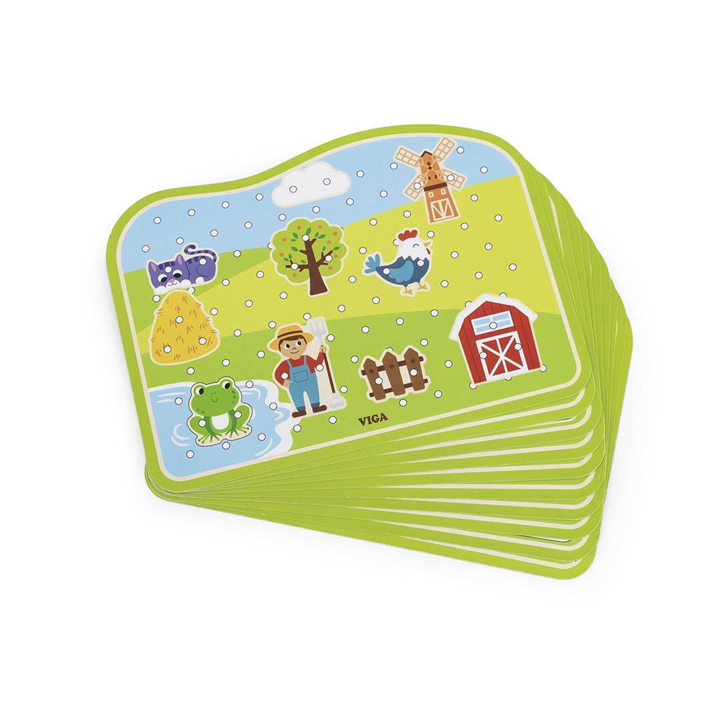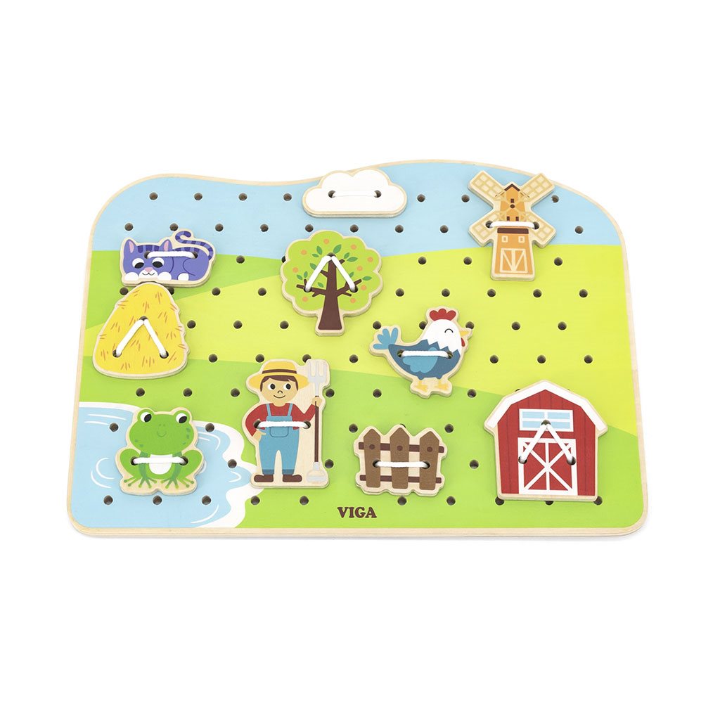 Vezna igra - kmetija podjetja Viga je ena najlepših igrač, ta tip igre izboljšuje očesno in motorično koordinacijo ter prostorsko usklajenost. Del igre je lesena osnova z luknjami in ilustracijo kmetije, 20 čudovito poslikanih ploščic z upodobitvijo domačih živali in narave ter 10 kartic, ki prikazujejo različne načine prepletanja dodatkov na ploščo. Otrok dodeljuje in prepleta ploščice z vzorci na karticah, ki so izmenično postavljene na osnovo. Malčki tako dobijo priložnost razvijati svojo domišljijo in si lahko iz razpoložljivih kosov sestavijo tudi svoje lastne zgodbe.