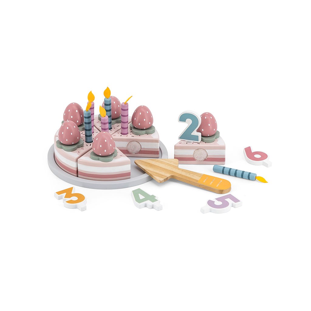 Lesena torta je igrača namenjena najmanjšim otrokom, ki se radi igrajo na zabavah in kot dodatek k kuhinjskim priborom. Spodbuja domišljijo in kreativnost, prav tako kot socialni razvoj in igranje vlog. Set obsega 26 kock, ki predstavljajo kose torte, jagodne okrase, svečke, številke, krožnike in lopate. Pripravite si rojstnodnevno zabavo.