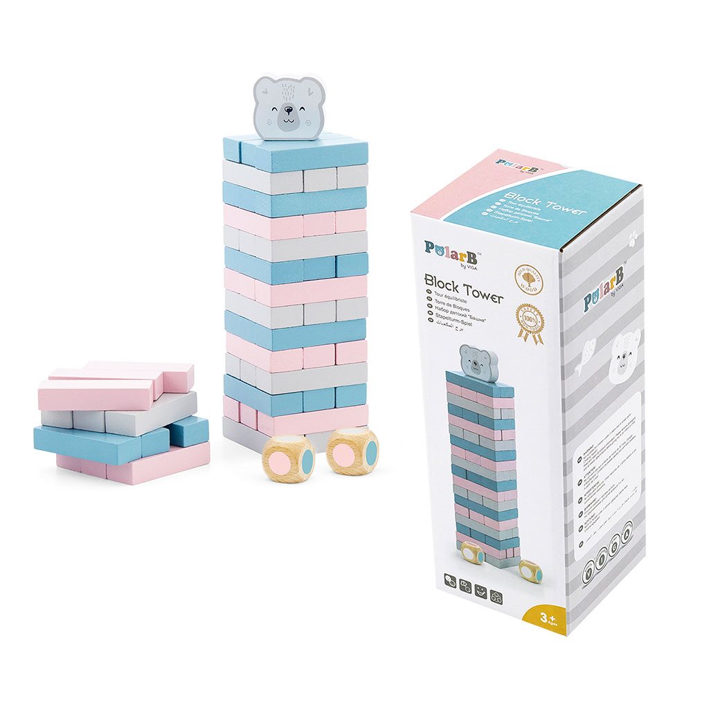Priljubljena igra sestavljanja stolpa - v novih umirjenih barvah podjetja VIGA - iz serije Polar Bear. Igra, ki se bo zagotovo vključila cela družina. Igra se začne s postavitvijo izhodiščnega stolpa iz lesenih kock na sredino mize ali tal. Ko imamo začetni stolp - si vsak igralec postopoma vzame en izbrani ali vlečeni blok iz sredine stolpa in ga položi na vrh stolpa, s čimer gradi stolp v višino. Cilj igre je zgraditi čim višji stolp. Igra razvija koordinacijo rok, pripomore k koncentraciji in je vir neskončne zabave za celo družino!