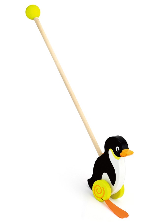 Lepa lesena igrača na palici Viga Penguin je odlična alternativa za vlečne igrače za otroke. Popolna izobraževalna igrača. Idealna za skupne sprehode in igranje doma. S to igračo boste doživeli veliko zabave, veselja in užitka. Gumeni elementi pritrjeni na kolesih na zabaven način posnemajo hojo živali. Igrača pomaga izboljšati ročne spretnosti in koordinacijo, uči otroka prepoznavati oblike in barve ter spodbuja in razvija občutek za opazovanje. Igrača je izdelana iz lakiranega lesa. Naša prednost je varnost in kakovost naših izdelkov, zato so barve, uporabljene na igračah, netoksične in izpolnjujejo varnostne standarde (EN71 in ASTM). Dimenzije igrače: dxvxš 15x8,3x5,6 cm. Namenjena otrokom od 2. leta dalje. Igrača je primerna kot čudovito darilo za naše najmlajše.