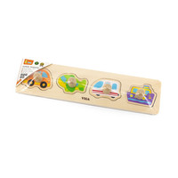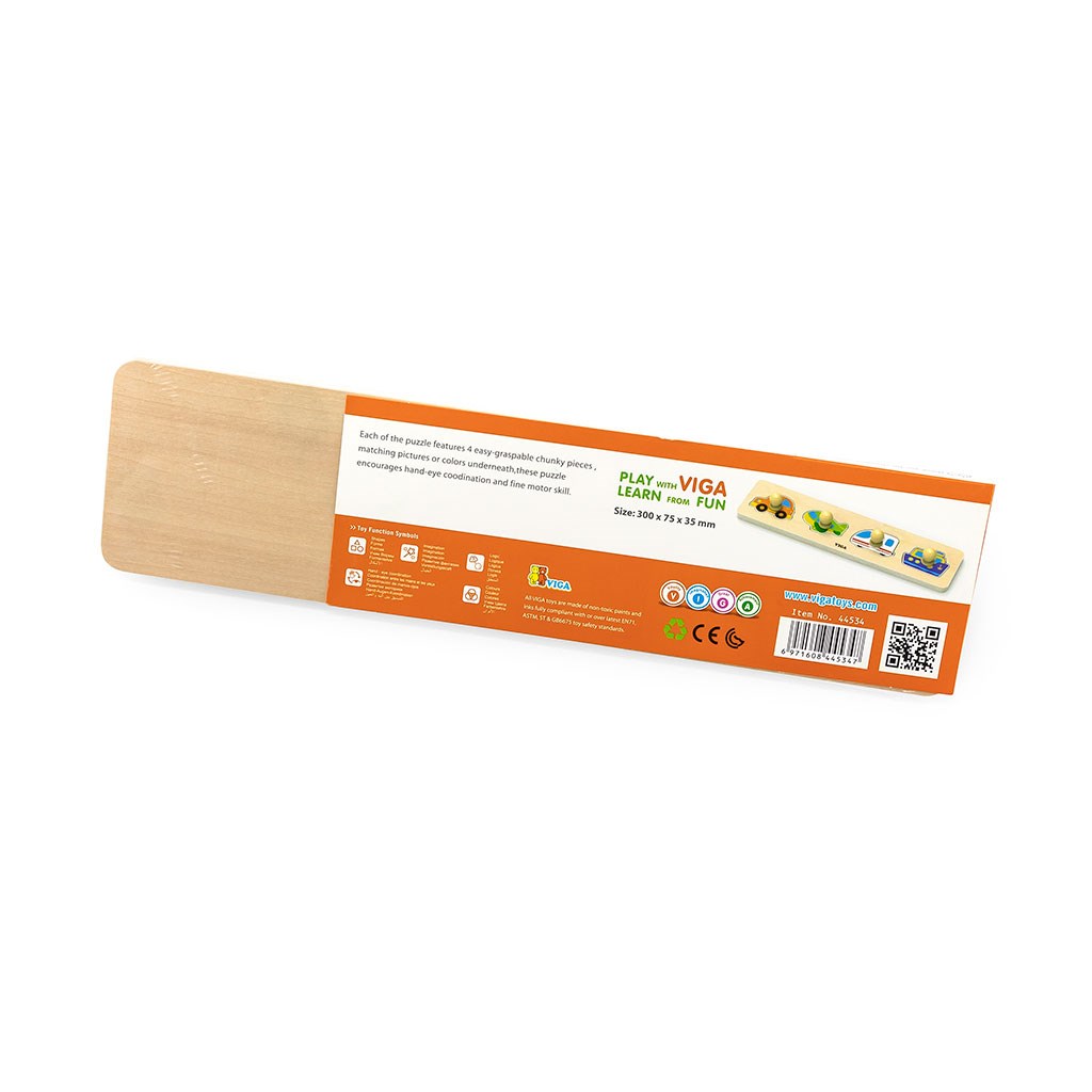 Čudovite, pisane otroške lesene puzzle s ročaji Viga. Otrokom zaradi ročajev puzzle lažje držijo v prstih in jih enostavneje vstavijo na predvidena mesta. Prav tako pomaga izboljšati ročno spretnost in okretnost ter hkrati uči otroka prepoznavati oblike in barve. Prispeva k razvoju motorike, izboljšuje koordinacijo in opazovalne sposobnosti otroka. Pakiranje vsebuje 4 kose. Namenjeno otrokom od 12 mesecev naprej. Prve puzzle za vaše male otroke so v zelo izrazitih barvah, preprostem dizajnu in velikih kosih. Naša prednost je varnost in kakovost naših izdelkov, zato so barve, uporabljene na igračah, netoksične in ustrezajo varnostnim standardom (EN71 in ASTM). Igrača je primerna tudi kot čudovito darilo za naše najmanjše. Dimenzija: 32x3x7,5 cm
