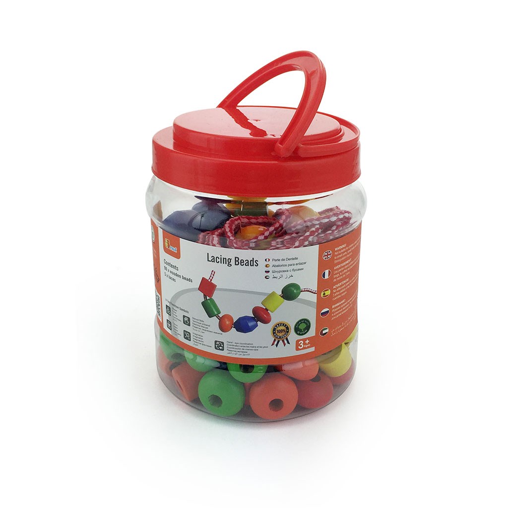 Pakiranje vsebuje 90 kosov barvnih kroglic različnih oblik in 5 kosov navoje. S pomikanjem lesenih kroglic po navoju lahko otroci ustvarjajo neskončne vzorce in kombinirajo različne oblike ter barve.