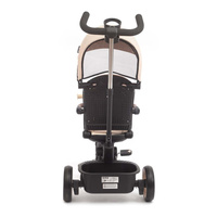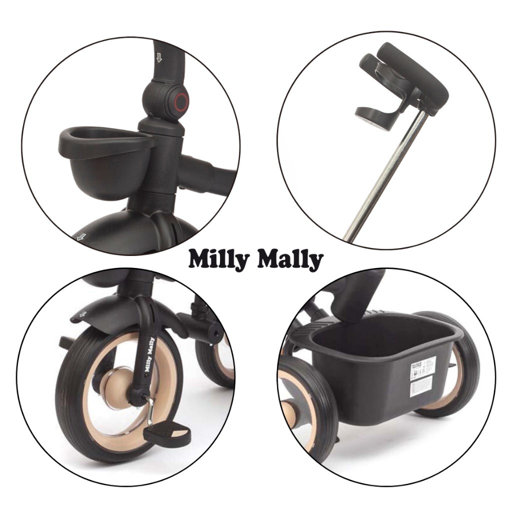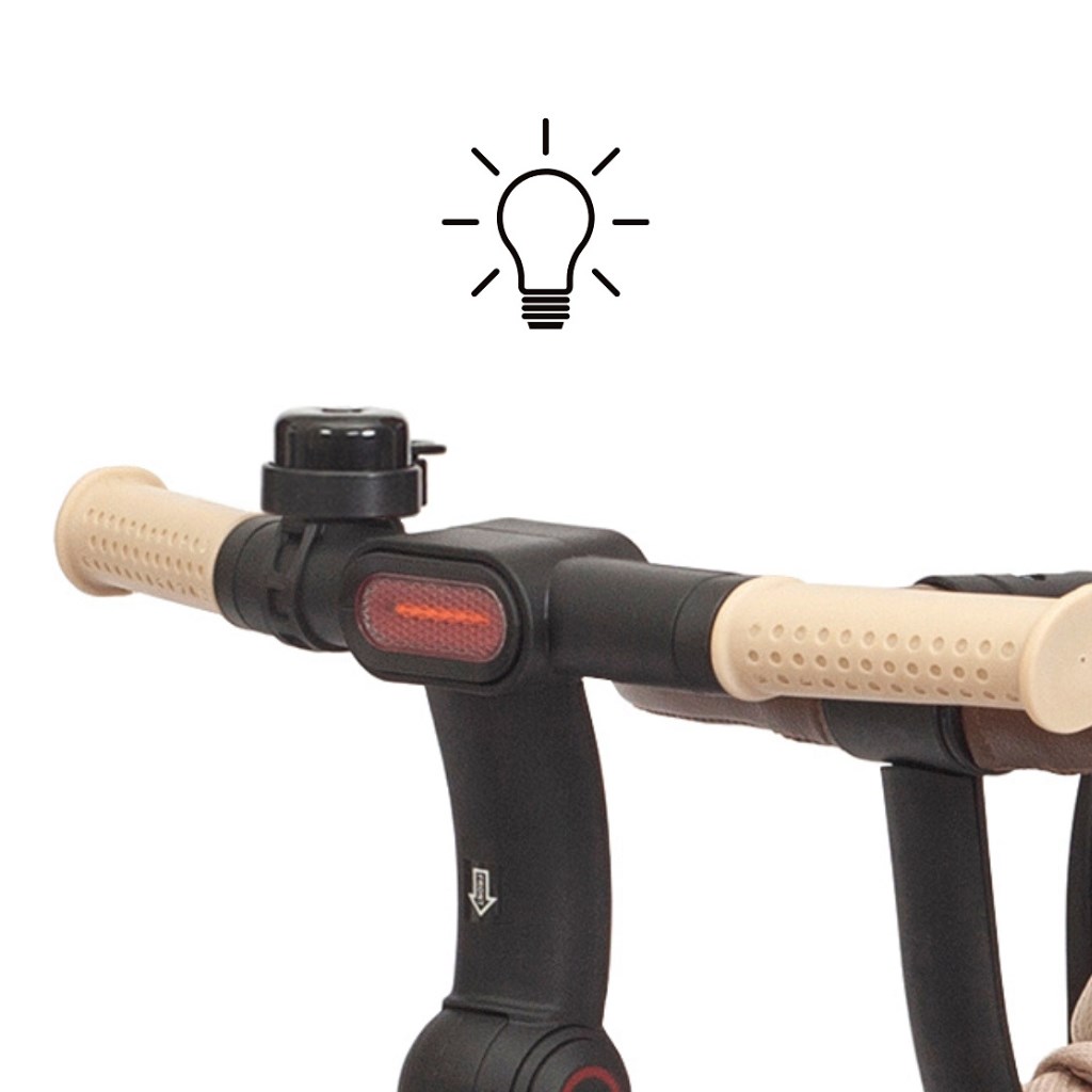 Twinkle je opremljen z nastavljivim ročajem, funkcijo prostega teka, zavoro, varnostnimi pasovi s zaščitniki ter udobnim trojnim naslonjalom in zagotavlja popoln nadzor in udobje za otroka in starše. Njena lahka, a trpežna jeklena konstrukcija, kolesa s penasto oblogo in krogličnimi ležaji, zložljiva konstrukcija ter praktične lastnosti, kot so mrežasta streha, LED lučka, nosilec za pijače in dva shranjevalna zaboja, jo delajo popoln izbor za vsako priložnost – v mestu, na sprehodu ali izletu. Po odstranitvi ročaja, ograj in strehe lahko Twinkle uporabljate kot klasično trokolko.