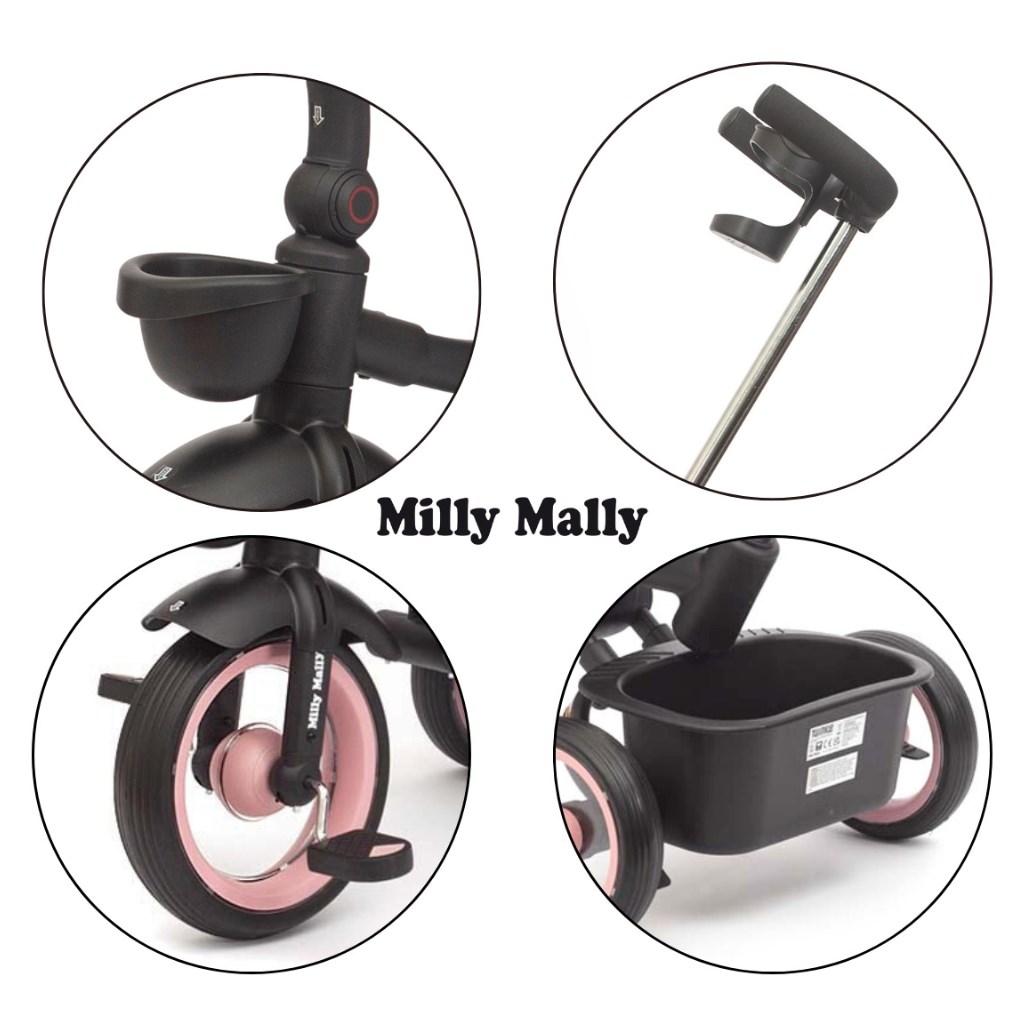 Twinkle je opremljen z nastavljivim ročajem, funkcijo prostega teka, zavoro, varnostnimi pasovi s zaščitniki ter udobnim trojnim naslonjalom in zagotavlja popoln nadzor in udobje za otroka in starše. Njena lahka, a trpežna jeklena konstrukcija, kolesa s penasto oblogo in krogličnimi ležaji, zložljiva konstrukcija ter praktične lastnosti, kot so mrežasta streha, LED lučka, nosilec za pijače in dva shranjevalna zaboja, jo delajo popoln izbor za vsako priložnost – v mestu, na sprehodu ali izletu. Po odstranitvi ročaja, ograj in strehe lahko Twinkle uporabljate kot klasično trokolko.