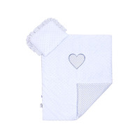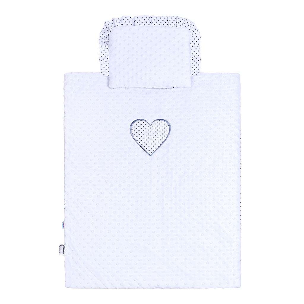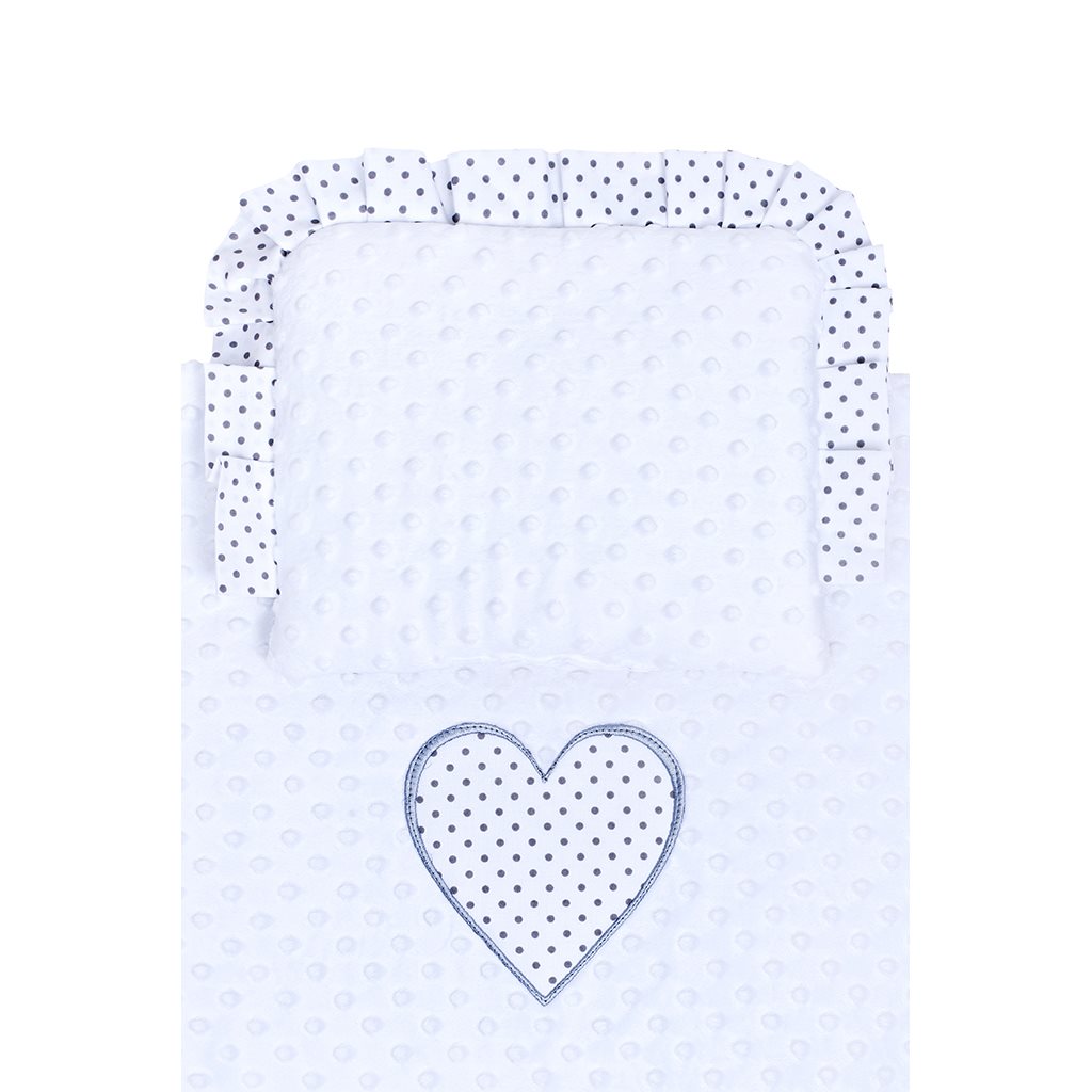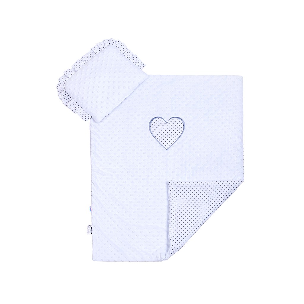 Lepota obojestranski set iz Minky New Baby za voziček. Na eni strani je Minky material, na drugi strani pa bombažna tkanina, ki je celovito potiskana s pikicami. Set vključuje blazino, okrašeno z volančkom, in odejo, na strani Minky pa je lepo našito veliko pikčasto srce. Poudarjamo kakovost, zato so odeje za voziček šivane iz zelo kvalitetnega materiala, ki ne izpušča barve in ne povzroča alergijskih reakcij. Zaradi tkanine Minky s površinskimi izboklinami se razvija otrokov otip, žive barve tkanin pa pritegujejo pozornost otrok. So nežne na dotik, tople, objemalne, edinstvene in zelo drugačne od drugih. Vse je napolnjeno z antialergičnimi vlakni. Sestava: prevleka 100% bombaž, 100% poliester, polnilo 100% poliester. Dimenzije: blazina: cca 25x32 cm, odeja: cca 82x68 cm. Ti proizvodi so varni, ker: