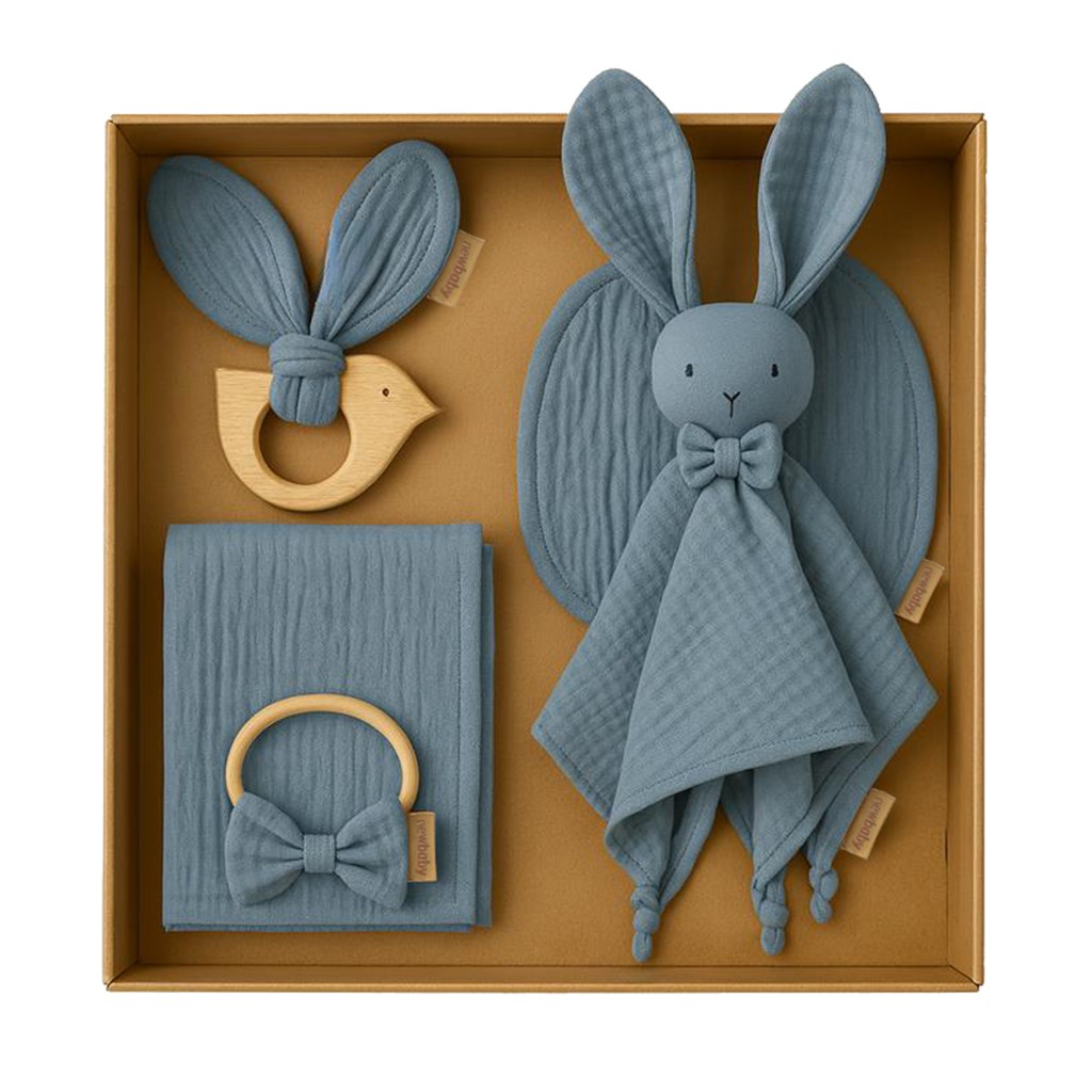 Izjemen darilni paket blagovne znamke New Baby je ustvarjen z ljubeznijo za najmlajše. Popolna izbira za Baby Shower, pozdrav novorojenčka ali kot darilo ob kateri koli posebni priložnosti. Vsebuje štiri skrbno izbrane dodatke, izdelane iz najfinejšega 100% organskega muslin bombaža in varnega bukovega lesa – vse certificirano in v skladu z evropskimi standardi.