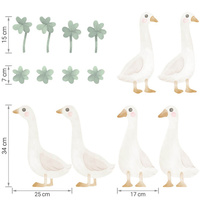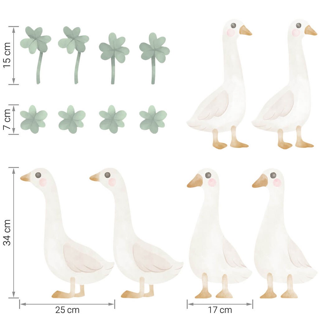 nalepke za steno gosi (6 kosov) in deteljice (8 kosov). Natančne dimenzije vsakega dela nalepke so navedene na zadnji fotografiji.