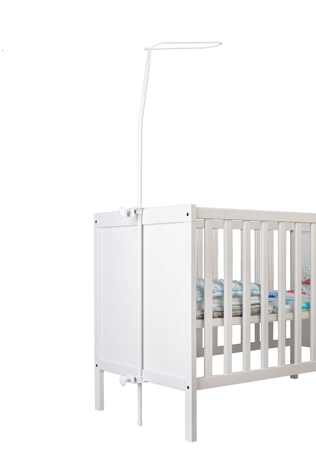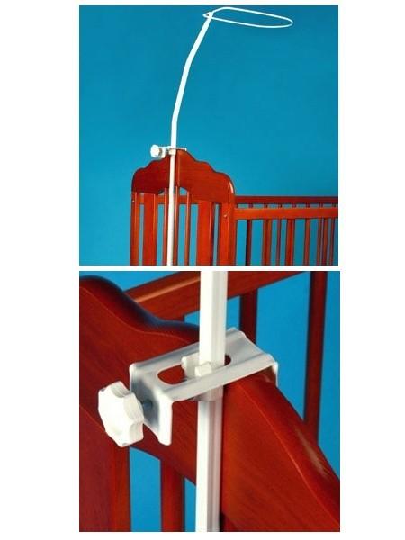 Vijačni nosilec za nebesa z dvema ročajema in nastavljivimi vijaki. Ročaje je mogoče poljubno premikati in prilagoditi tako posteljici. V zgornjem delu nosilca je žica za pritrjevanje nebes.