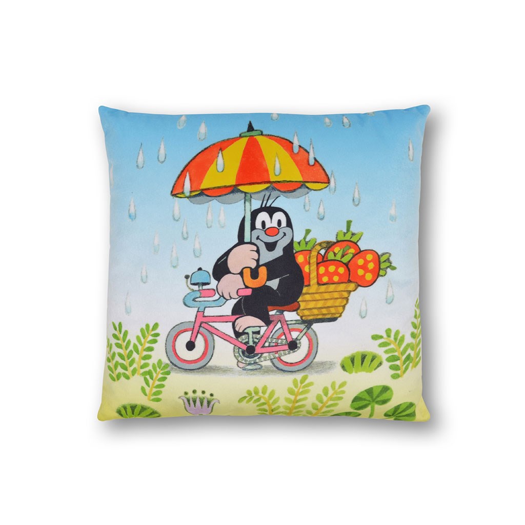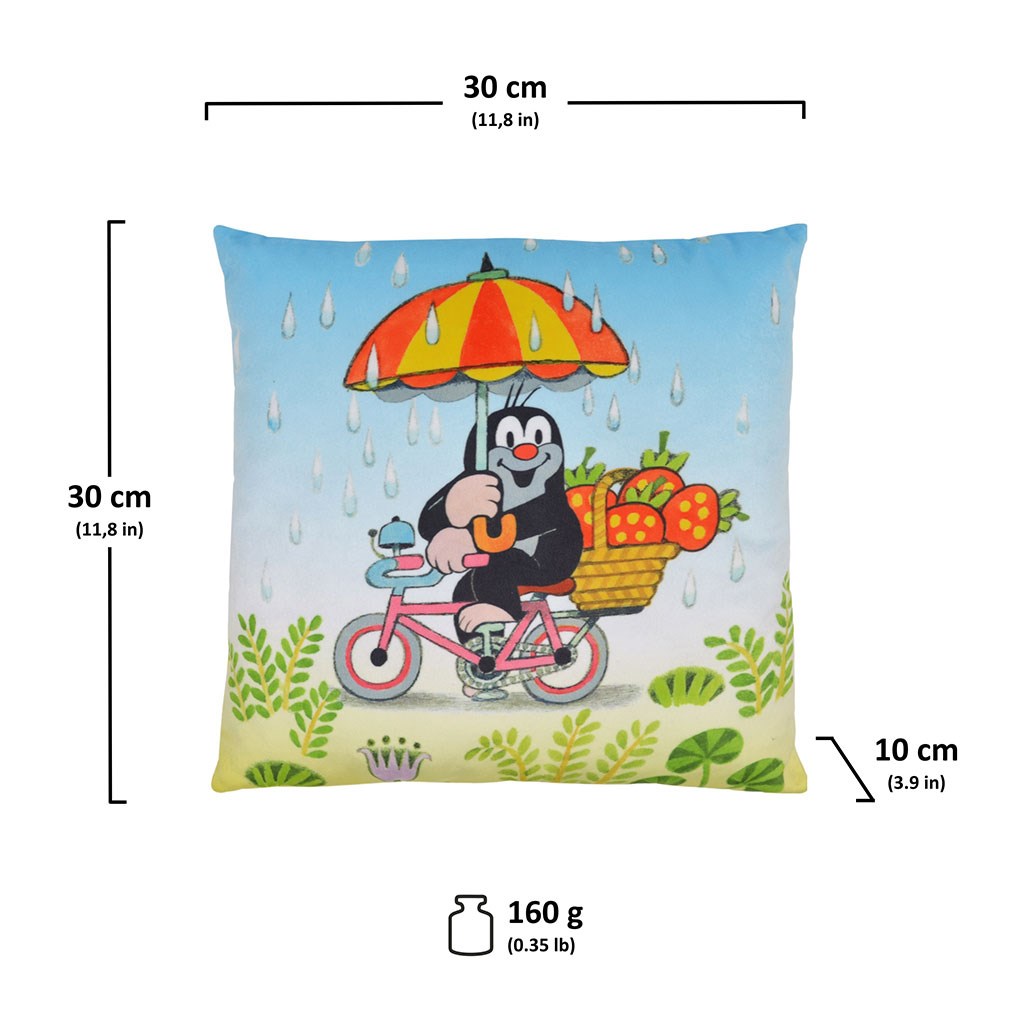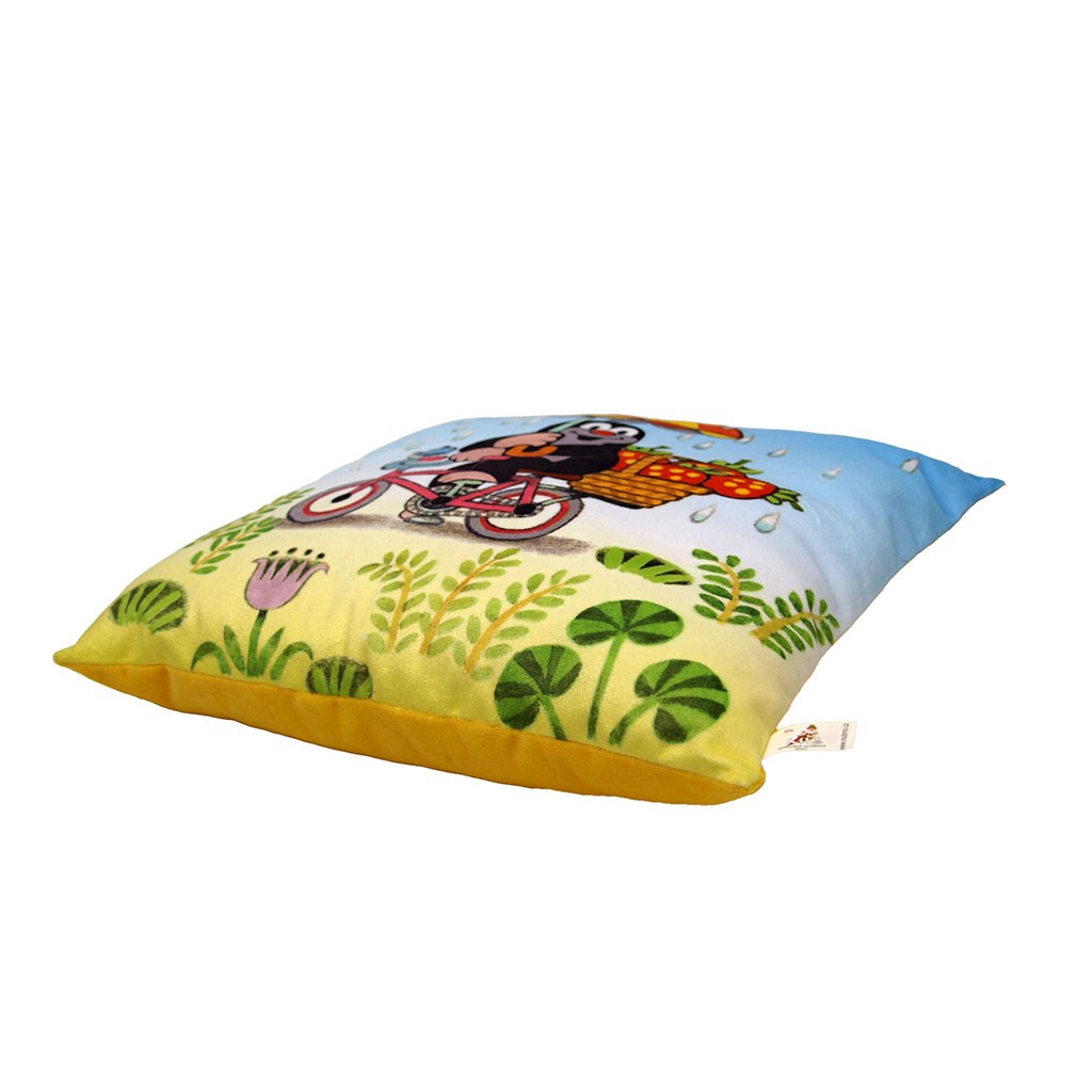 Mehak stolček z motivom Krtečka, primeren za posteljico, na potovanju ali kot dekoracija v sobici. Material mikrovelur, slika tisk, polnilo iz votlih vlaken. Zadnja stran svetlo modra.