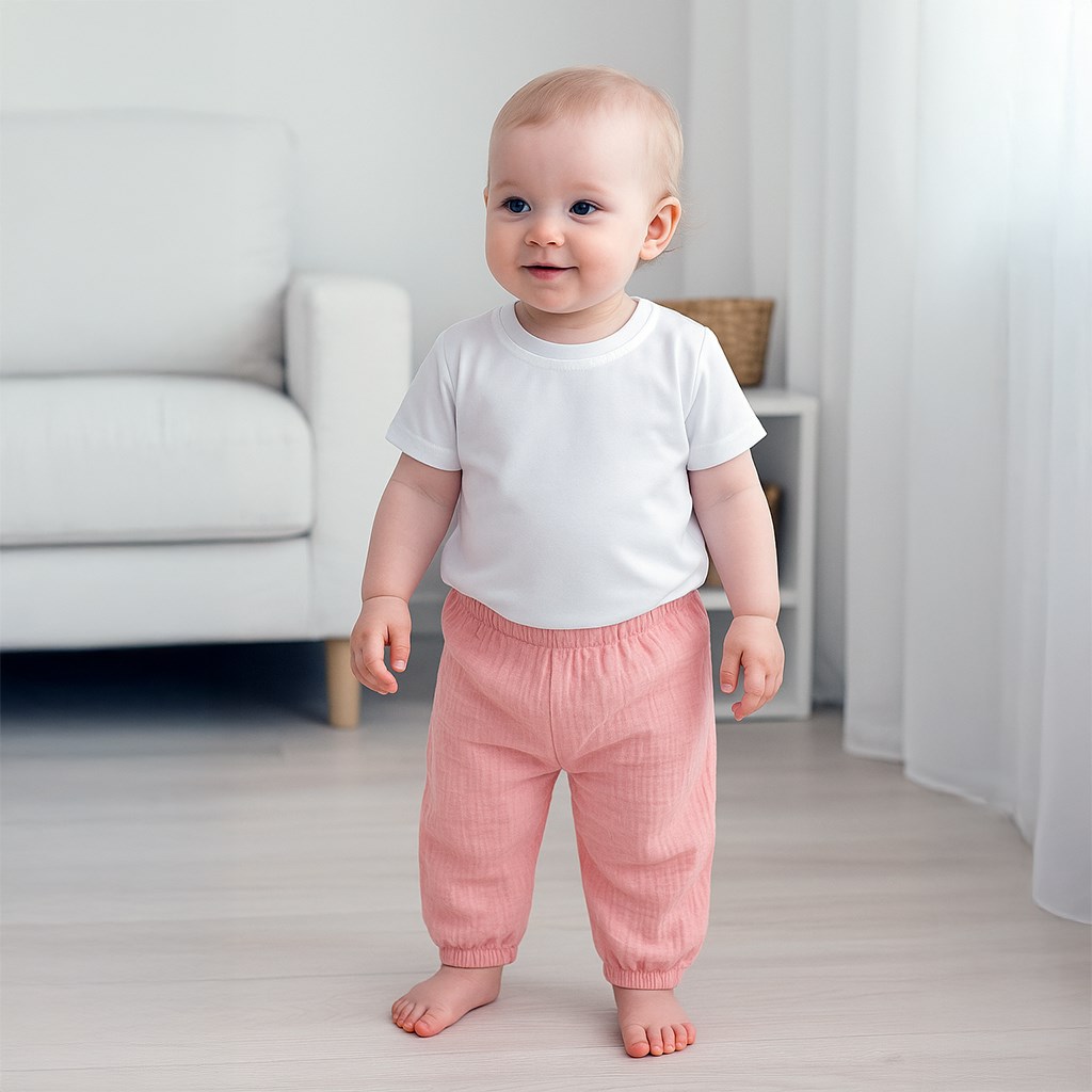 Stilska in praktična 2-delna otroška obleka češke blagovne znamke New Baby Kindergarten. Obleka se sestavlja iz bombažne majice s kratkimi rokavi in muslinastih hlač. Zelo praktičen set za otroke tudi v vrtec. Bombažna majica je zelo udobna, saj je izdelana iz kakovostnega bombaža, brez zapenjana, z neženim robom okoli vratu. Rob ne sme pritiskati, obviti in majico je treba enostavno obleči čez glavo. Muslinaste otroške enobarvne hlače z modernim dizajnom so narejene iz kakovostnega muslina. Za zelo enostavno oblačenje imajo praktičen prosti kroj, v pasu in na hlačnicah je gumica, ki ne pritiska. Hlače so zelo primerne tudi za običajne otroške aktivnosti. Sestava: 100% bombaž. OEKO-TEX STANDARD 100.