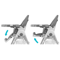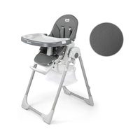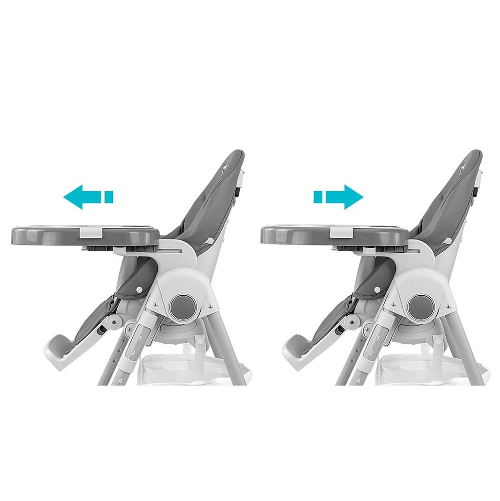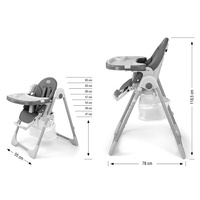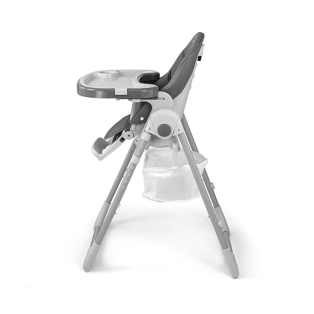 Oblačilo stolice je izdelano iz ekološke usnje in ima dodatno mehko blazino za najmlajše. Za varnost otroka je opremljena s 5-točkovnimi nastavljivimi pasovi in dodatno zaščito proti zdrsu. Na zadnji strani naslonjala je ročaj za obešanje pladenj. Naslonjalo in opiralnik za noge sta lahko nagibna do ležečega položaja. Sedež je mogoče dvigniti ali znižati v 7 stopnjah, noge pa imajo vgrajena gumijasta kolesca. Celotno konstrukcijo je enostavno in gladko zložiti.