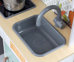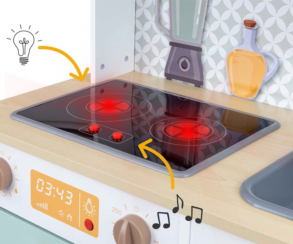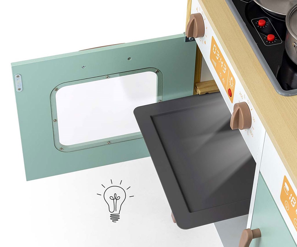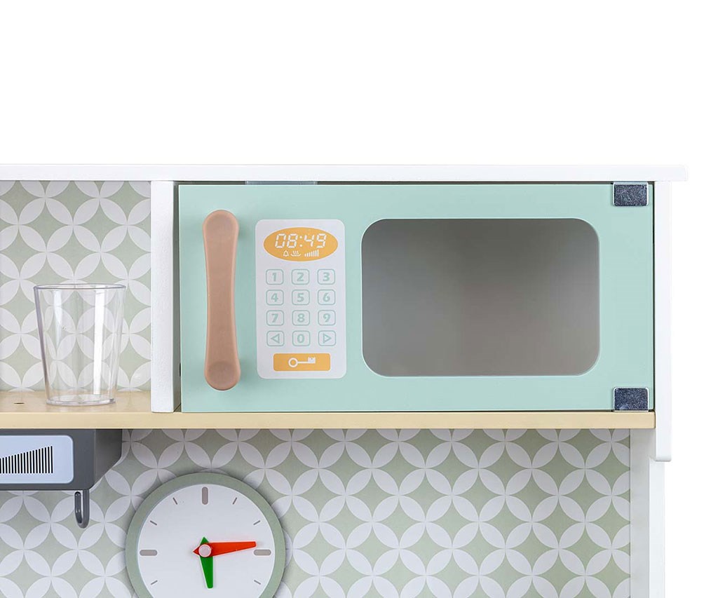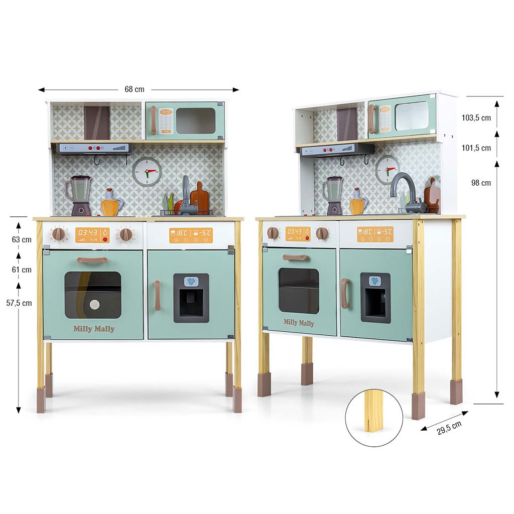 Milly Mally je stavila na bogato opremo, ki vključuje ponev, lonec s pokrovom ter lesene kuhalnice, ki jih je mogoče obesiti na kljuke pod napo. Otroci se s to igračo učijo odgovornosti za svojo kuhinjo in čiščenje med igro. Ta kuhinja je prav tako opremljena z višinsko nastavljivimi nogami, kar zagotavlja, da raste skupaj z otrokom.