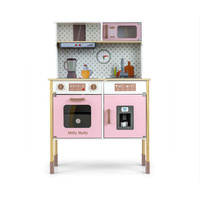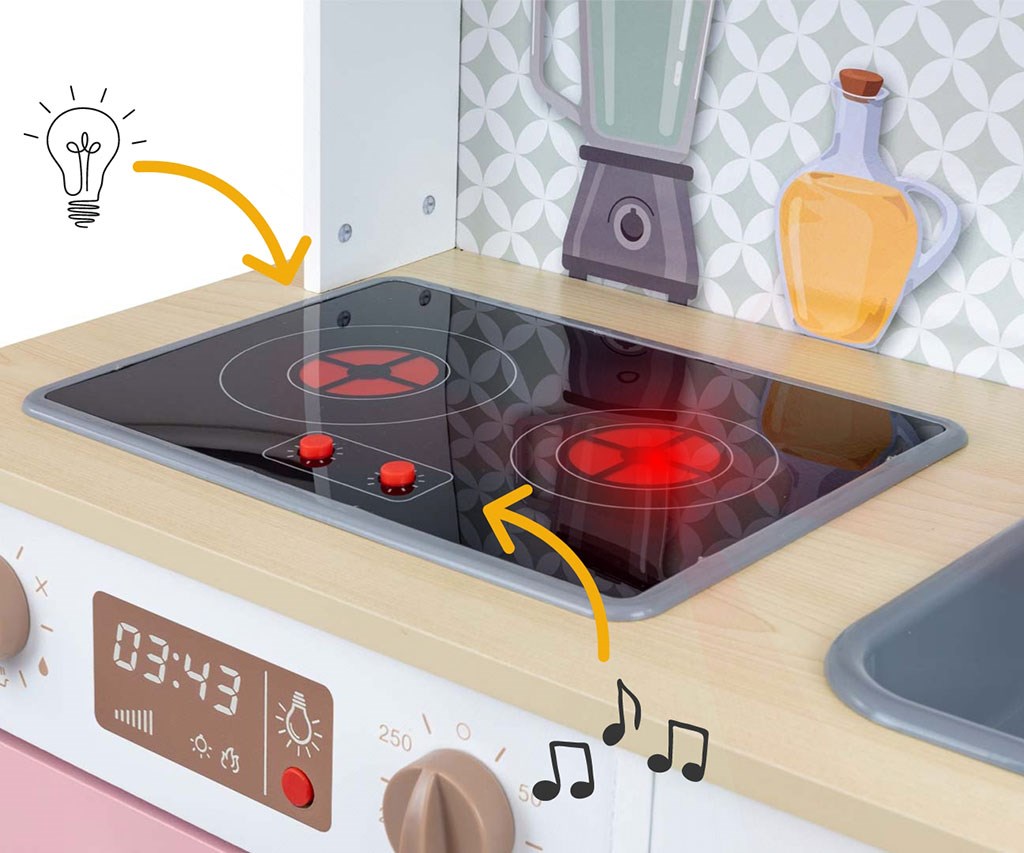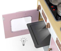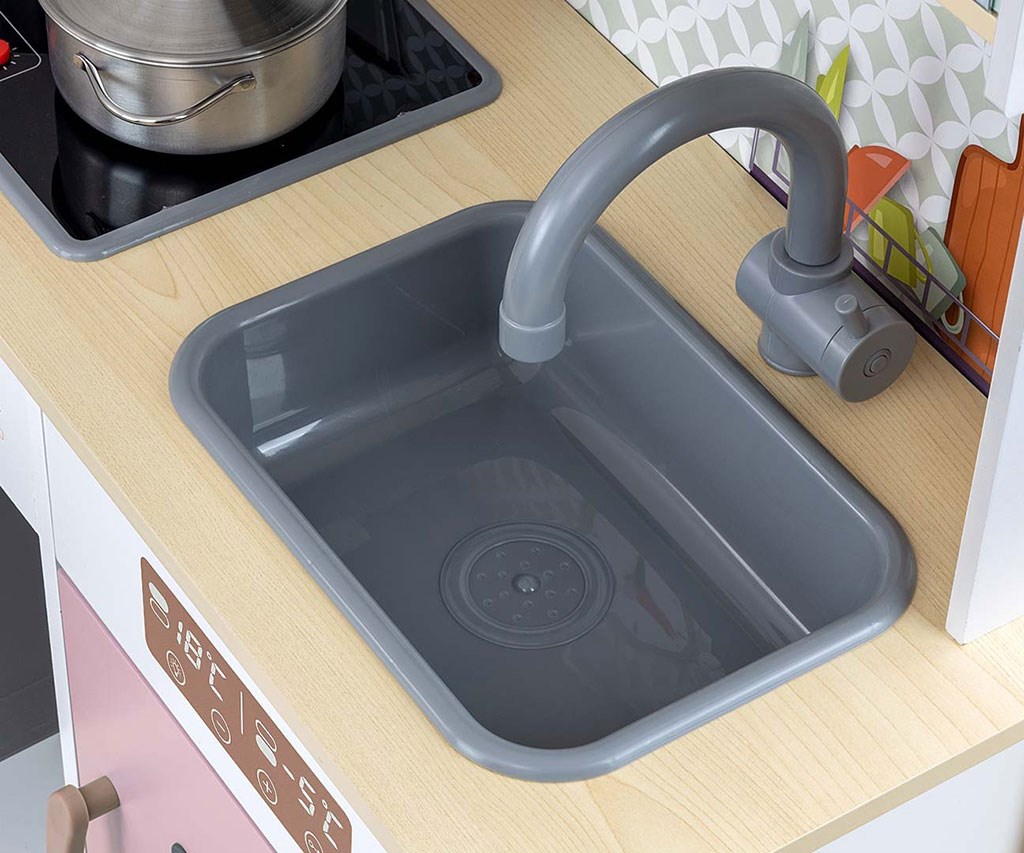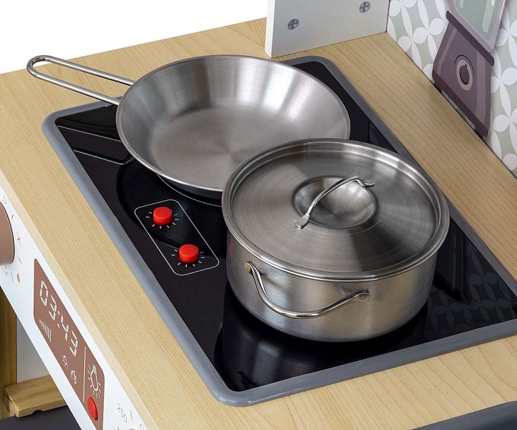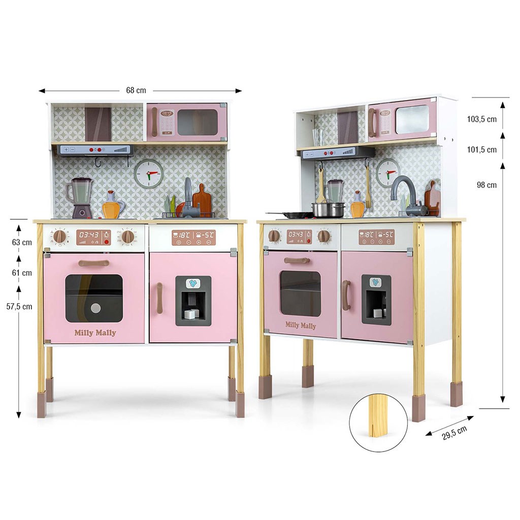 Milly Mally je stavila na bogato opremo, ki vključuje ponev, lonec s pokrovom ter lesene kuhalnice, ki jih je mogoče obesiti na kljuke pod napo. Otroci se s to igračo učijo odgovornosti za svojo kuhinjo in čiščenje med igro. Ta kuhinja je prav tako opremljena z višinsko nastavljivimi nogami, kar zagotavlja, da raste skupaj z otrokom.