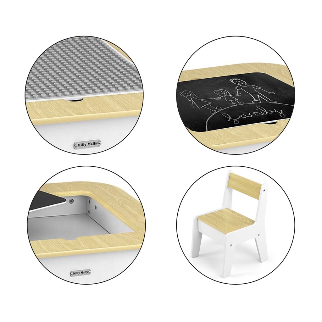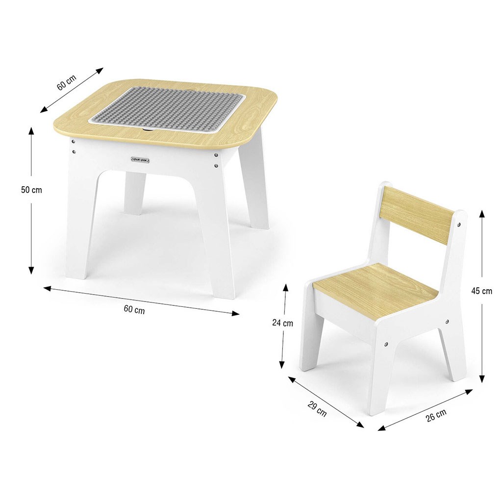 Set Olaf Blocks izstopa z edinstveno mizo – ena stran je prilagojena za gradbene kocke, kar jo naredi za idealno osnovo za gradnjo. Druga stran je gladka in popolna za risanje, pisanje ali druge ustvarjalne dejavnosti. Plošča je snemljiva, pod njo pa se nahaja prostoren prostor za shranjevanje, ki olajša shranjevanje igrač, kock ali ustvarjalnih potrebščin, kar pripomore k ohranjanju reda.