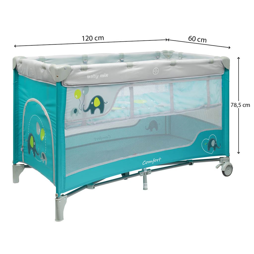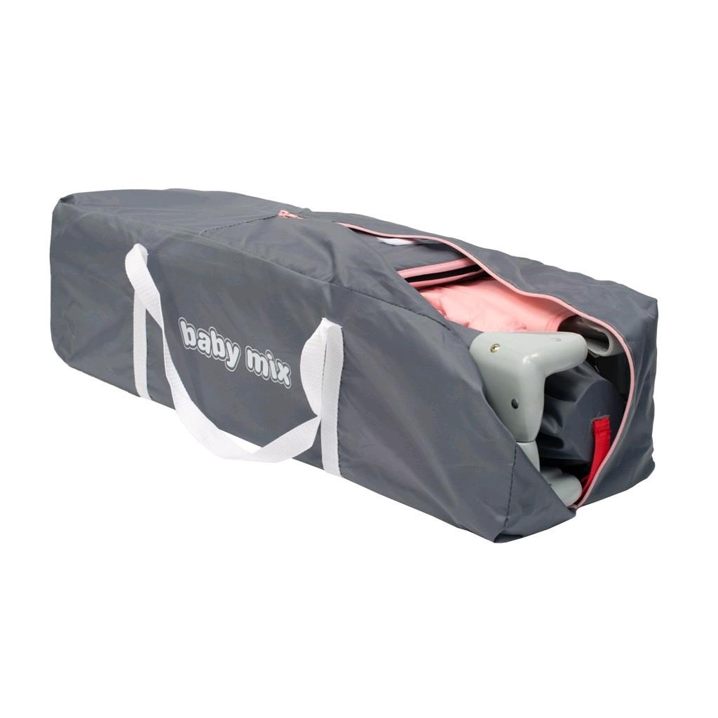 Praktična prenosna potovalna posteljica Baby Mix ne služi le kot potovalna posteljica, temveč tudi kot ograja. Uživajte v času, preživetem s svojim malčkom, kadarkoli ste na dopustu ali na potovanju. Tudi stari starši lahko uživajo v prisotnosti svojih vnukov, tudi če nimajo otroške posteljice. Z enostavnim zložljivim mehanizmom posteljico hitro in enostavno zložite, jo vstavite v priloženo praktično torbo z naramnicami in jo udobno spravite v avto. Posteljica je zelo lahka, opremljena je s kolesi z vgrajeno zavoro, kar omogoča enostavno premikanje v drugo sobo, na balkon, teraso ali vrt.