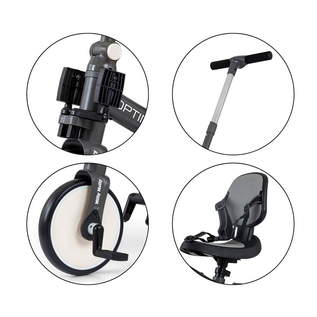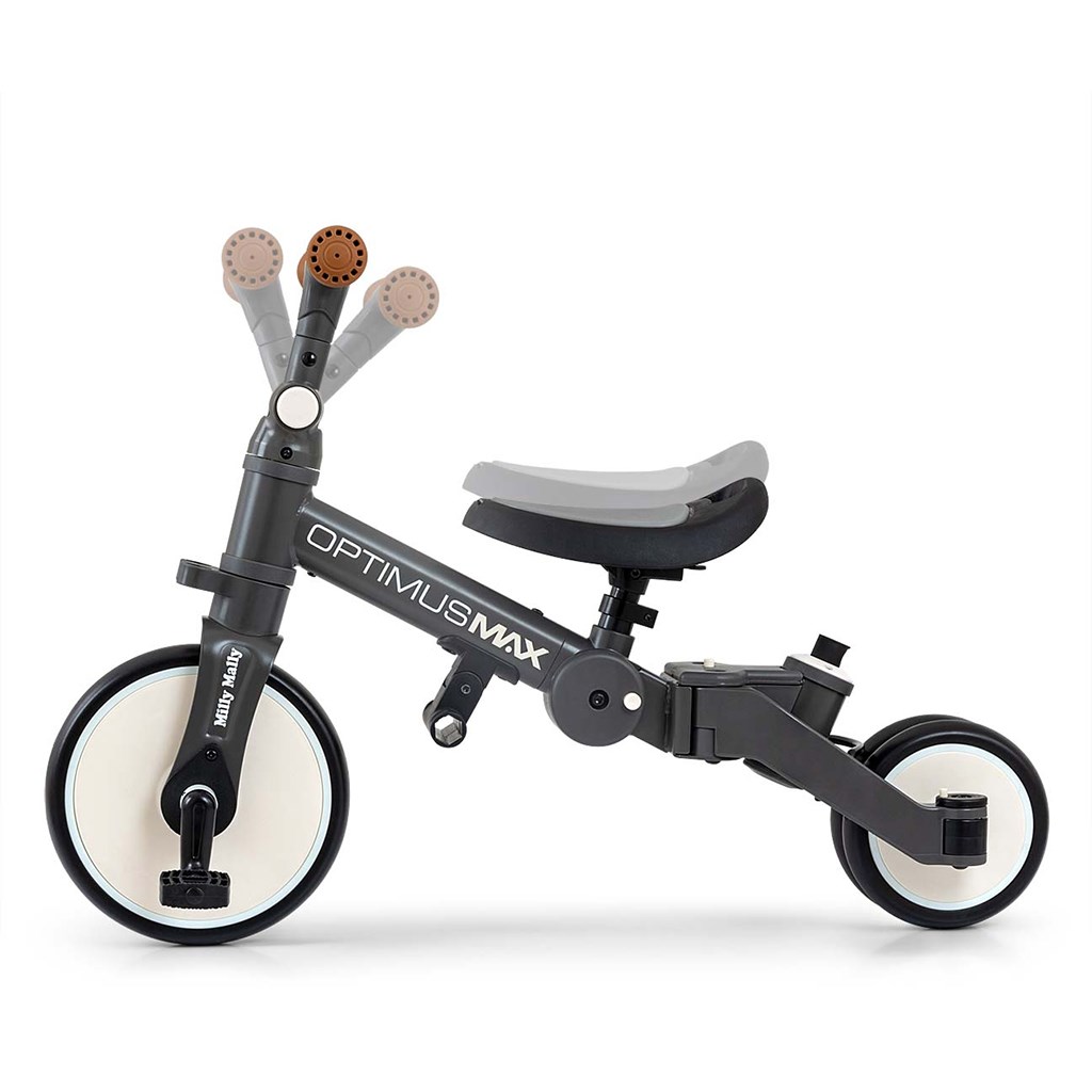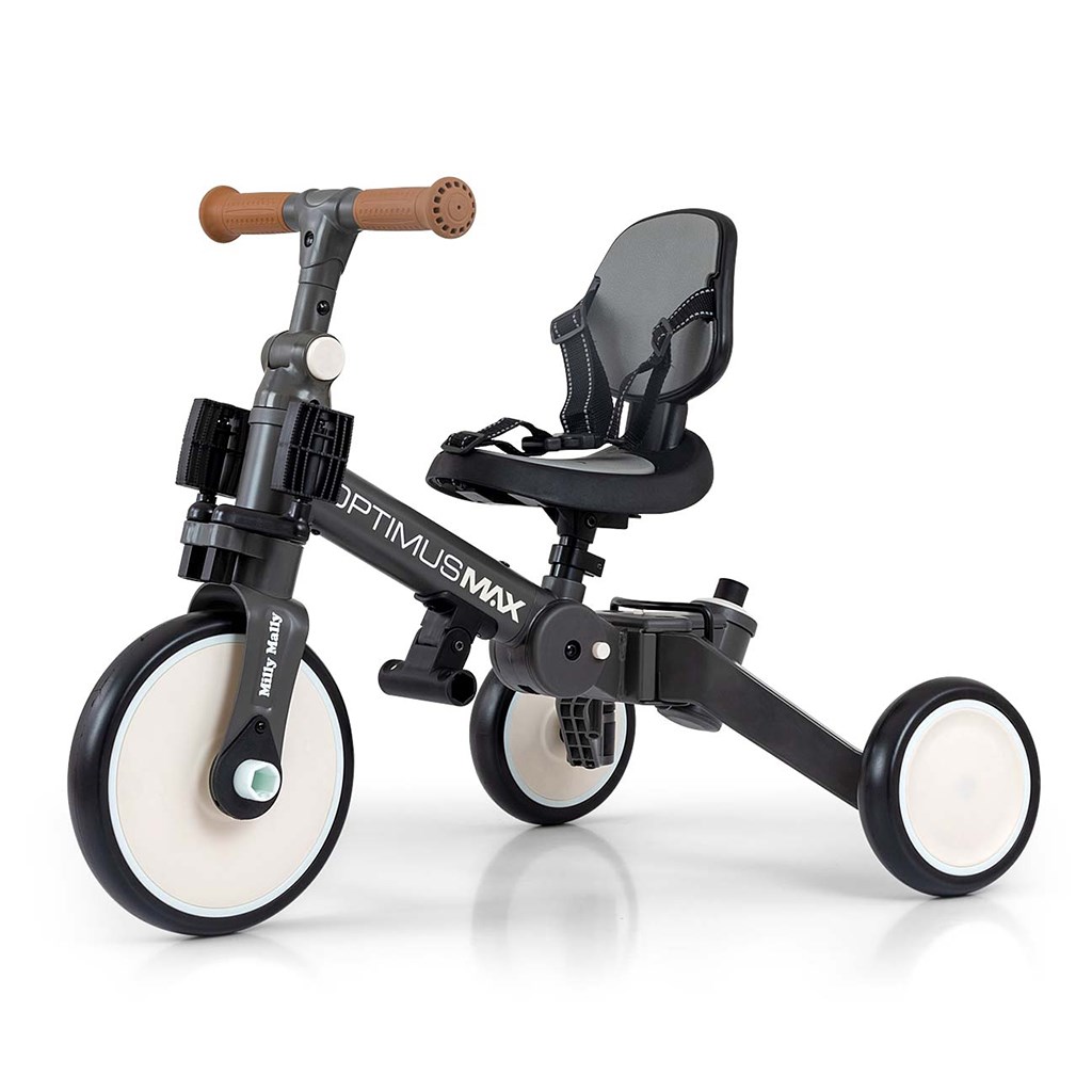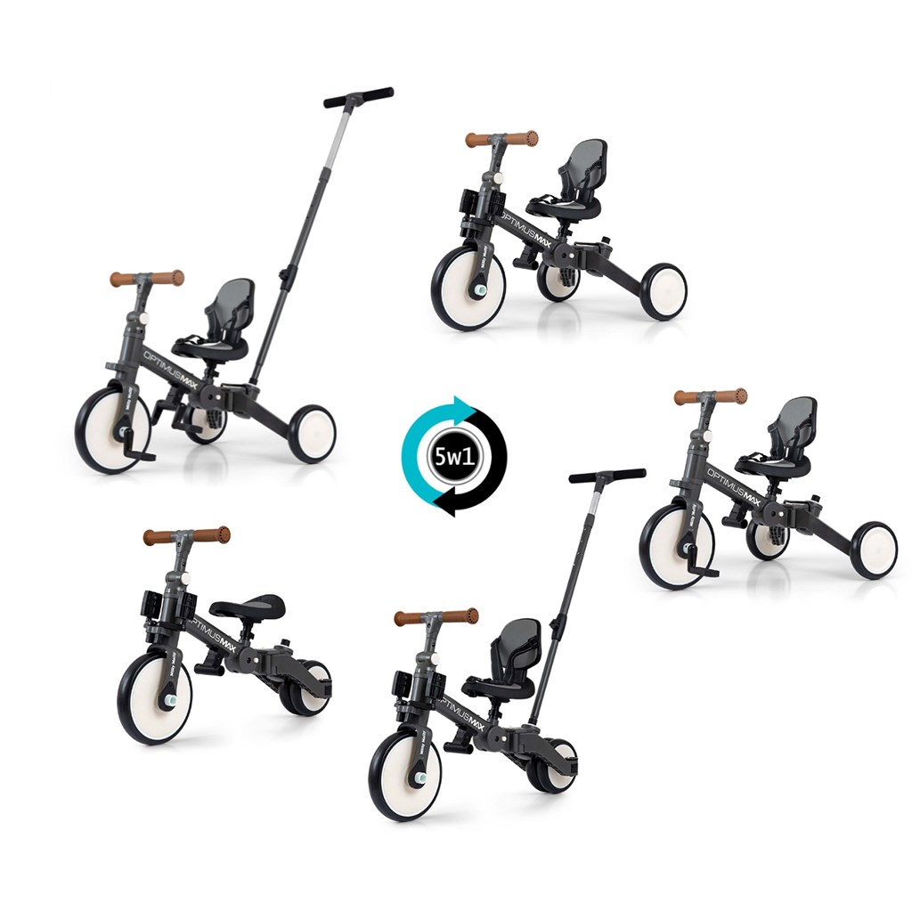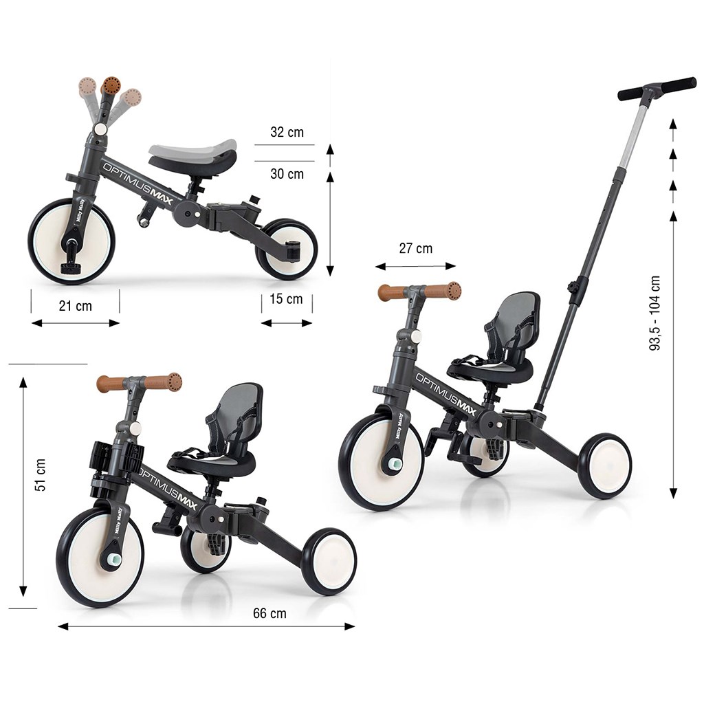 Optimus Max je zasnovan kot eno najboljšo izbiro za prvo vozilo vašega otroka. Zaradi stabilne trokolne konstrukcije nudi ustrezno raven varnosti in olajša pridobivanje novih veščin. Ko otrok obvlada osnove vožnje in ne potrebuje več pomoči staršev preko ročaja za krmiljenje, lahko dodamo pedalke ali ga preuredimo v klasično održevalko.