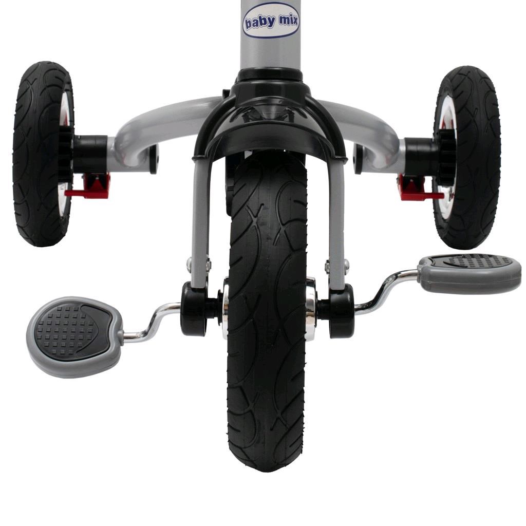 Otroška pedalna tricikel Baby Mix TYPHOON je večnamensko prevozno sredstvo in je tipičen primer izdelkov GROW UP - raste ob otroku. Tricikel lahko upravljata tako otrok kot starš s pomočjo nastavljive vodilne palice. Po odstranitvi vodilne palice, zložljive strehe in opor, bo služil kot klasičen pedalni tricikel. Trdna jeklena konstrukcija zagotavlja otroku varnost in zagotavlja uporabo več let. Udoben in ergonomsko oblikovan sedež se vrti za 360 stopinj, kar otroku omogoča, da potuje v smeri ali proti smeri vožnje. O udobju in varnosti med vožnjo skrbijo odstranljiva čeljust, trisedežne varnostne pasove, udobne odstranljive stopnice ali gumijasta kolesa, ki odlično absorbirajo neravnine, zagotavljajo popolno oprijemljivost in ne zahtevajo napihovanja. Za shranjevanje igrač ali potrebščin za otroka je tu praktična shranjevalna košara.