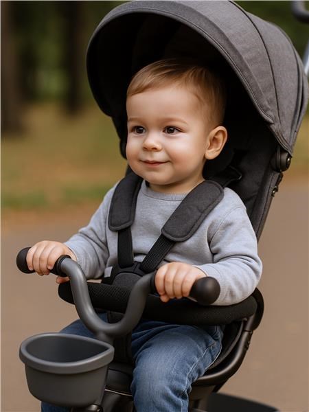 Otroška tricikel Baby Mix 5v1 RELAX je večnamensko prevozno sredstvo in tipičen primer izdelkov GROW UP - raste skupaj z otrokom. Tricikel lahko upravlja tako otrok kot starš z nastavljivo vodilno palico. Po odstranitvi vodilne palice, zložljive strehe, ki ščiti pred soncem ali drugih komponent, bo služil kot tricikel. Ima moderno zasnovo, udoben in ergonomično oblikovan sedež, ki je pomičen in vrtljiv za 360 stopinj, kar otroku omogoča, da potuje v smeri ali proti smeri vožnje. Izdelan je iz kakovostnih in trpežnih materialov, zložljiva konstrukcija omogoča brezskrbno transportiranje tricikla npr. v prtljažniku avtomobila. Njegovo zlaganje je zelo preprosto, intuitivno in ne zahteva orodja. Za udobje in varnost med vožnjo poskrbi odstranljiva ograja, pettočkovni varnostni pasovi, udobni pedali ali kolesa, izdelana iz trde EVA pene, ki odlično absorbirajo neravnine, zagotavljajo odličen oprijem in ne potrebujejo napihovanja. Za shranjevanje igrač ali potrebščin za otroka je tukaj praktična shranjevalna košara.