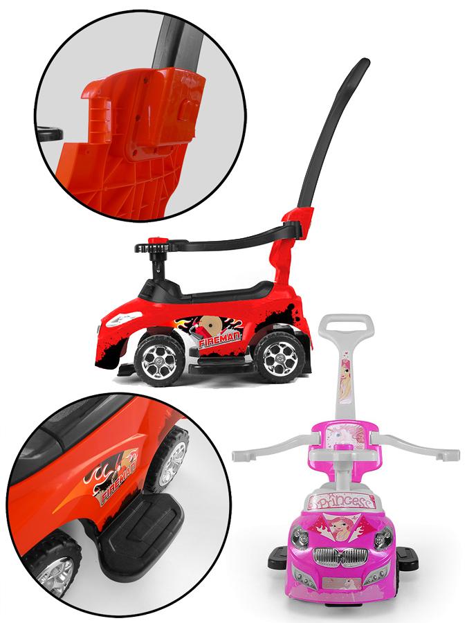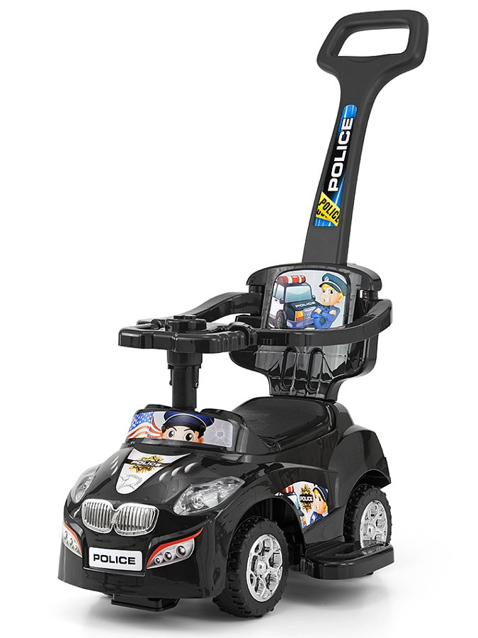Otroški avtoček Milly Mally Happy. Avtoček ima na volanu gumb, ki po vklopu predvaja melodije, in gumb, ki po vklopu izdaja zvok klaksóna. Avtoček lahko uporabite kot odrivanje, ali pa po dodajanju vodila, stopničke in ročaja lahko otroka vozite sami in ga imate pod nadzorom. Izdelan je iz kakovostnega plastičnega materiala. To je odlična in varna igrača. Oblika igrače pomaga razvijati motorične sposobnosti otroka v času, ko se uči hoditi. Zaobljeni robovi in trdna kolesa zagotavljajo varnost pri igri. Baterije niso vključene v paket.