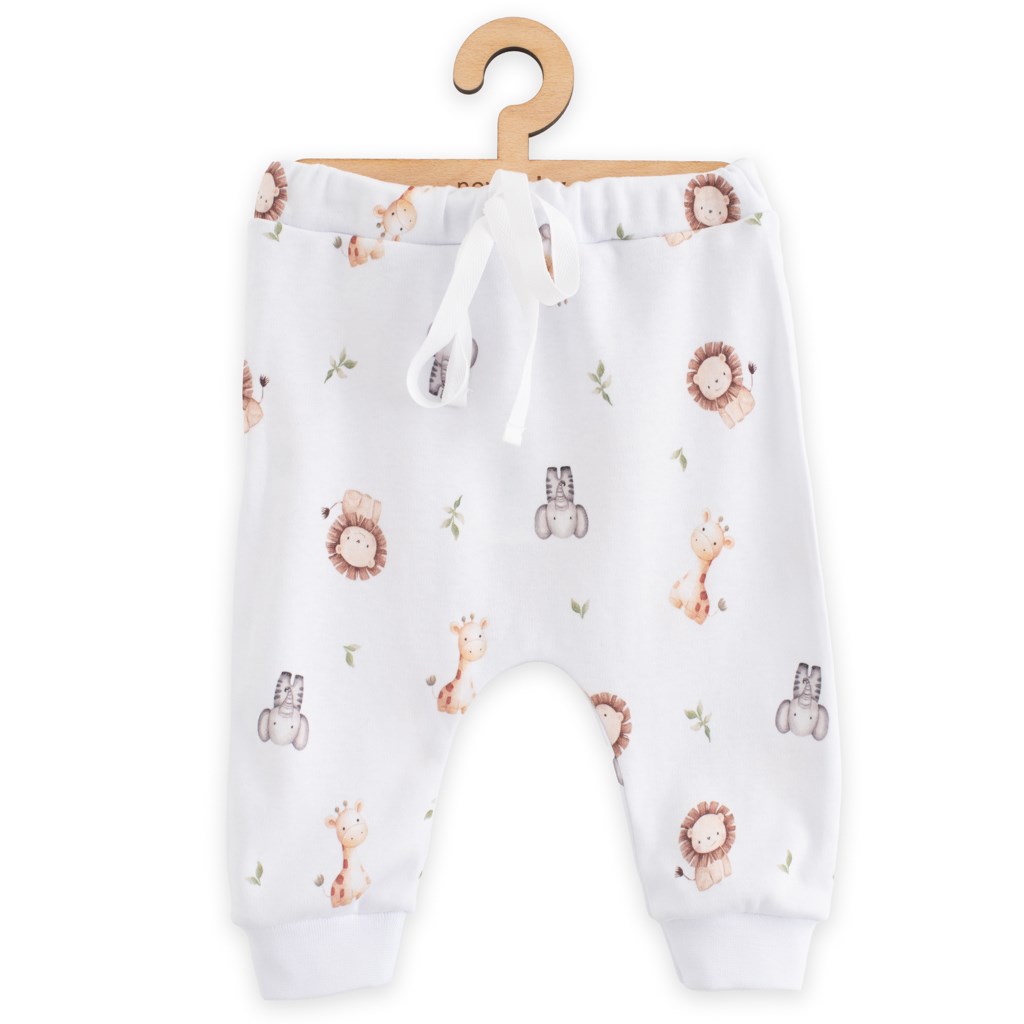 Bombažne hlače za dojenčke so celovito potiskane z izvirnim otroškim motivom. Za enostavno oblačenje imajo v pasu elastiko, ki ne pritiska, ter všit pas za vezanje. Na hlačnicah so našiti širši robovi.