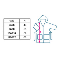 Praktičen in kakovosten otroški plašč z kapuco češke blagovne znamke New Baby Comfortably. Plašč je izdelan iz prijetnega in toplega frotirnega materiala. Kapuca ščiti mokro glavico pred mrazom, mehka in topla tkanina pa je idealna za občutljivo otroško kožo. Otroški plašč se zaveže z vstavljenim pasom. Otroka pas ne moti in ga ne izgubi med hojo. Dodatna prednost našega plašča so globlje žepki za otroške potrebščine. Je idealen ne le po kopanju, temveč tudi po plavanju v bazenu ali morju. Dimenzije so navedene na zadnji fotografiji. Sestava: 100% bombaž. OEKO-TEX STANDARD 100. 240g/m2.