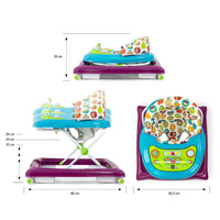 Izdelek ima učni panel, ki vsebuje vrsto presenečenj, ki čakajo na male raziskovalce: lučke, piščalke, melodije, grizala, gumbe in druge premične elemente. Po odstranitvi panela z pladenjčka hodila služi kot samostojna igrača, na primer kot potovalni spremljevalec, plošča pa služi kot igralna miza.