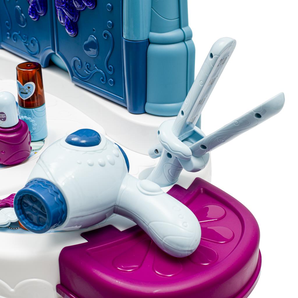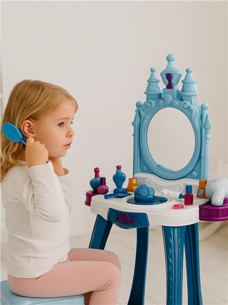 Otroška toaletna mizica z taburetom vključuje set maket kozmetike, kot so fen, glavnik, laki za nohte, prstani, cvetlice za lase, zapestnice, ogrlica in nalepke. V setu je tudi umetna palica, ob pritisku na palico se odpre ogledalo. Toaletna mizica ima predal za shranjevanje drobnarij. Set zahteva 5AA baterij, ki niso priložene.