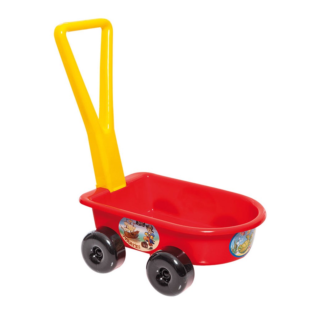 Otroški barvni voziček, izdelan iz kakovostnega plastičnega materiala, s štirimi kolesi in premično ročico. Na vozičku so tudi veseli motivi. Dimenzije: 43x27 cm. Namenjeno otrokom od 36 mesecev starosti. Barva - rdeča.