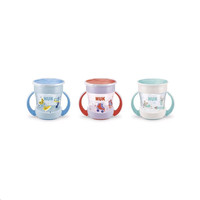 Otroška skodelica Mini Magic NUK 360° z pokrovom. Revolucionalni pokrov omogoča pitje brez cevi ali slamice z vseh strani, kar otroku pomaga, da se uči piti samostojno kot iz običajne skodelice. Trening skodelica z 360° pitnim robom, odporna proti prelivanju, pomaga otrokom učiti se piti iz velike skodelice brez, da bi se polili. Treniranje otroških mišic, ki se morajo razviti. Pijača začne teči šele, ko pokrov stisnejo otroške ustnice, tako da se ni treba bati, da bi se tekočina prelila iz skodelice. Idealno za potovanja ali izlete. Primerno za otroke od 6 mesecev. Ne vsebuje BPA. Lastnosti: