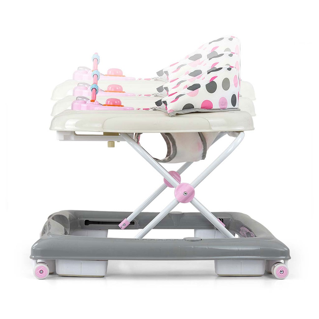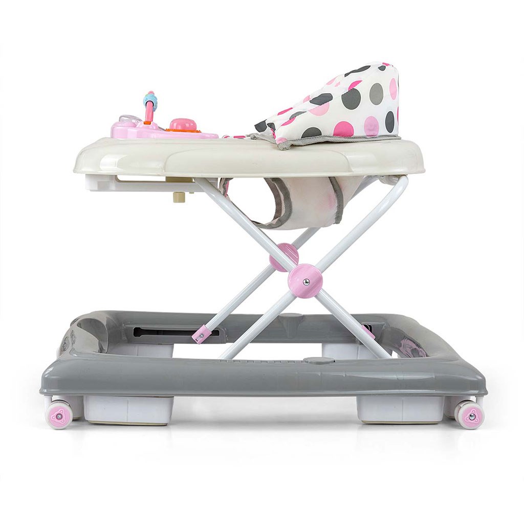 Štiri kakovostna vrtljiva kolesa, ki ne praskajo površin, po katerih se premikajo, zagotavljajo svobodo gibanja, in osem gumijastih zavor ščiti otroka pred zdrsom s stopnic ali drugih ovir.