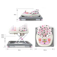 Izdelek ima učni panel, ki vsebuje vrsto presenečenj, ki čakajo na male raziskovalce: lučke, piščalke, melodije, grizala, gumbe in druge premične elemente. Po odstranitvi panela z pladenjčka hodila služi kot samostojna igrača, na primer kot potovalni spremljevalec, plošča pa služi kot igralna miza.