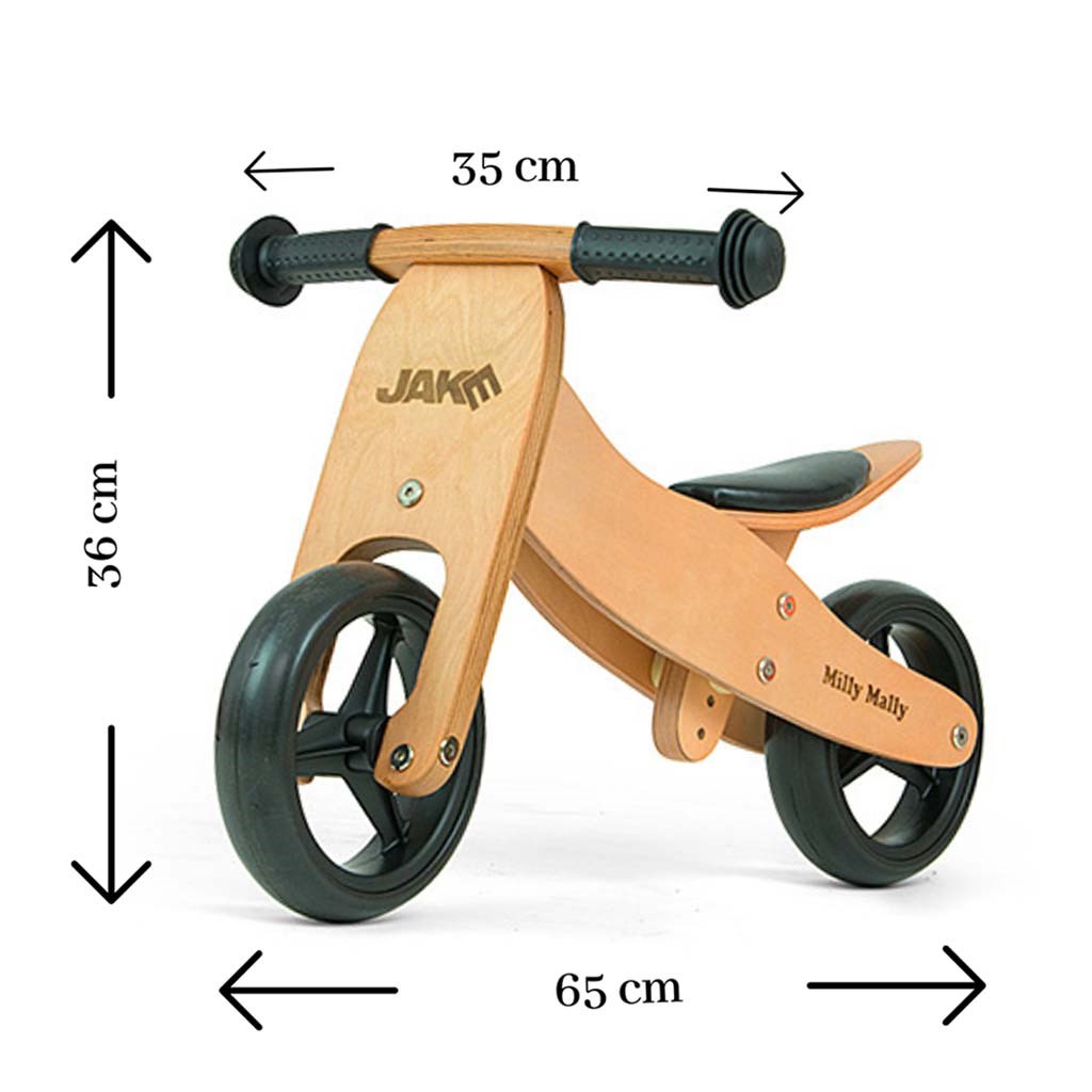 Otroško multifunkcijsko leseno odrivalo Milly Mally JAKE je idealno za otroke, ki se šele začenjajo učiti voziti kolo in še ne obvladajo ravnotežja na dveh kolesih. Prednost odrivalo JAKE je, da se iz trikolesa enostavno spremeni v odrivalo na dveh kolesih. Narejeno je iz trdnega lesa s čudovitimi veselimi barvami in slikami s penastimi kolesi. Široke razdalje koles zagotavljajo izjemno stabilnost, varnost in udobje doma in na prostem. Mehka nedrsljiva ročica zagotavlja zaščito roke otroka. Čudovito multifunkcijsko odrivalo, ki ugaja tako deklicam kot dečkom.