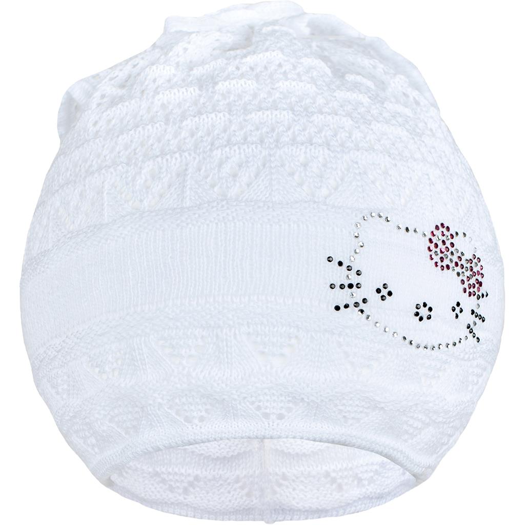 Pomladna pletena kapica-šal New Baby. Kapico krasi slika muce z bleščečimi kamenčki. Kapica je narejena iz zračnega materiala, zato je primerna za pomladne in jesenske dni. Idealna za majhne in večje deklice. Sestava: 100% bombaž. Material je elastičen. Obseg okoli glavice približno 40-50 cm.