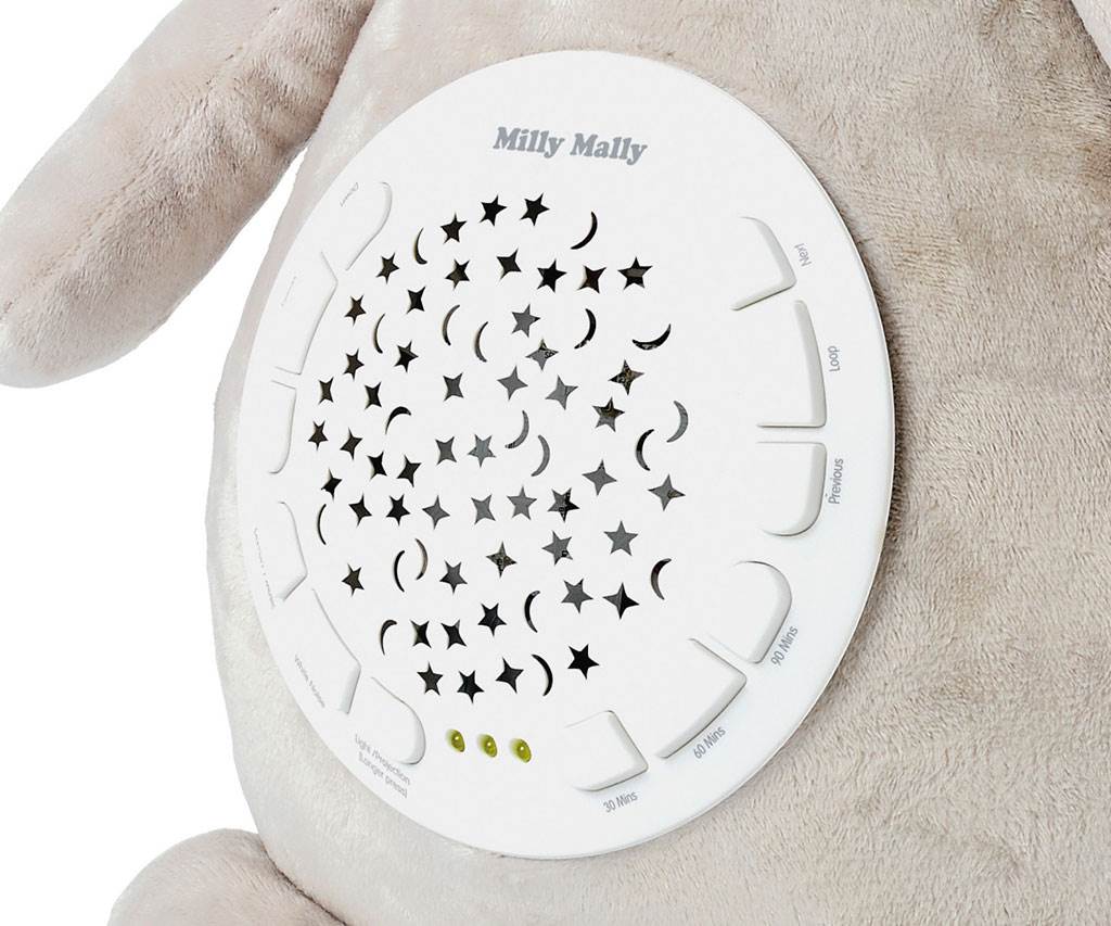 Lahko nastavite primerno trajanje: 30, 60, 90 minut. Na voljo je 5 ravni glasnosti. Odličen dodatek funkcijam je 5 vrst belega šuma, ki ima na dojenčke še posebej pomirjujoč učinek, kar omogoča, da se umirijo in hitreje zaspite. S to igračo boste slišali nežne zvoke: žuborenje vode z zvoki ptic, utrip srca, kapljanje vode, petje ptic ali padajoči dež.