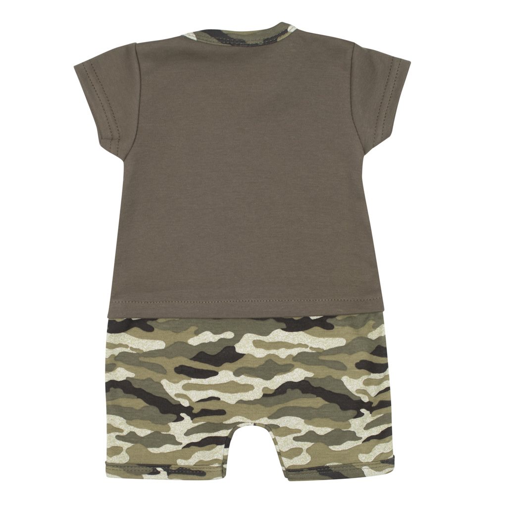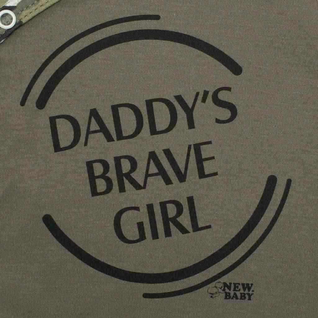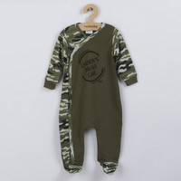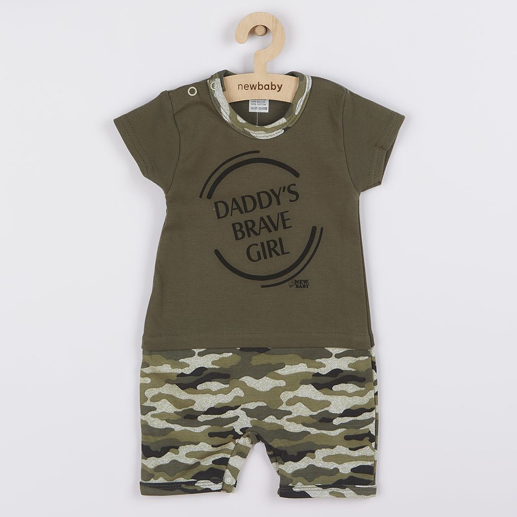 Stilna poletna bombažna pajkica s kratkimi rokavi češke blagovne znamke New Baby Army. Dekliška pajkica je okrašena s kamuflažnim potiskom in napisom DADDY´S BRAVE GIRL. Ima praktično zapiranje na gumbe na naramnicah in med nogicami, kar olajša oblačenje in previjanje. Šarmantna poletna pajkica bo razveselila vse fante. Vojaški stil se je vrnil v modo in je osupljiv. Poudarjamo kakovost, zato se bo vaše dojenček počutil zelo prijetno zahvaljujoč prijetnem, mehkem in kakovostnem materialu. Sestava: 100% bombaž.