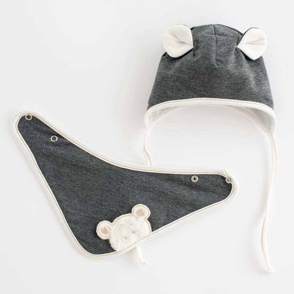 Pomladni 2-delni set češke blagovne znamke New Baby Sebastian. Set zajema kapico in rutko za vrat. Kapica z podlogo je lepo oblikovana za ušeska, zavezuje se na vezalko in dobro drži na glavici dojenčka. Rutko za vrat je možno zapeti v 2 velikostih. Kvaliteten in zelo praktičen dodatek za vsako vreme je okrašen z motivom medvedka. Za New Baby je zadovoljstvo strank zelo pomembno in prav zato vam ponujamo set iz kolekcije New Baby Sebastian. Zunanji material: 95% bombaž, 5% elastan. Podloga: 95% bombaž, 5% elastan. Primerno za pomlad in jesen.